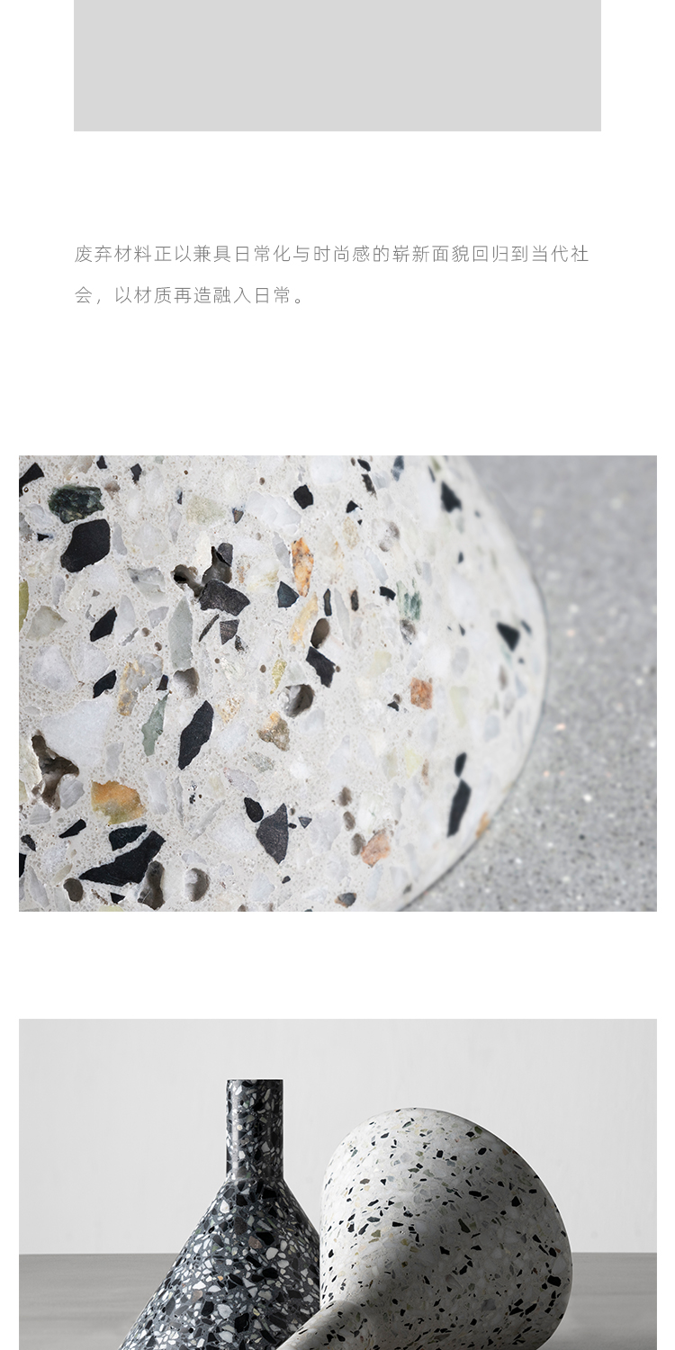 以材质再生为基本手段的水磨石系列,将陶瓷废渣再生成简洁形态的日常性家具,以衍生产业的形式回归到大众层面的使用中。 中国佛山,这片拥有全球最大最成熟的陶瓷产业链和产业集群的建筑陶瓷工厂的土地,承载着每年400万吨陶瓷废弃物带来的环境污染。 以材质再生融入日常,不仅是激发商业价值的大胆尝试,是环保理念的日常化实践,更是对自我尊严的基本坚守和追求,我们探寻陶瓷跨越地域局限的一种当代突破!