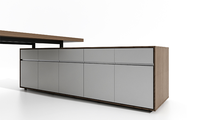 METALLI在芬兰语中是“金属”的意思。金属是一种具有 光泽、富有延展性等性质的物质。坚硬、金属感十足, 静态冷冽与动态灵动的结合;时尚,精致。背柜上设计 师延伸了班台的钢脚,轻薄却饱含金属感;镜面不锈钢 装饰加上铣凹槽拉手,干净、冷冽。