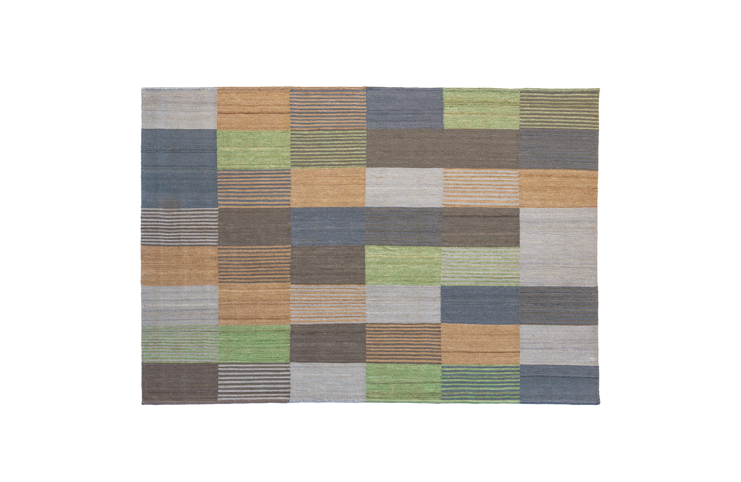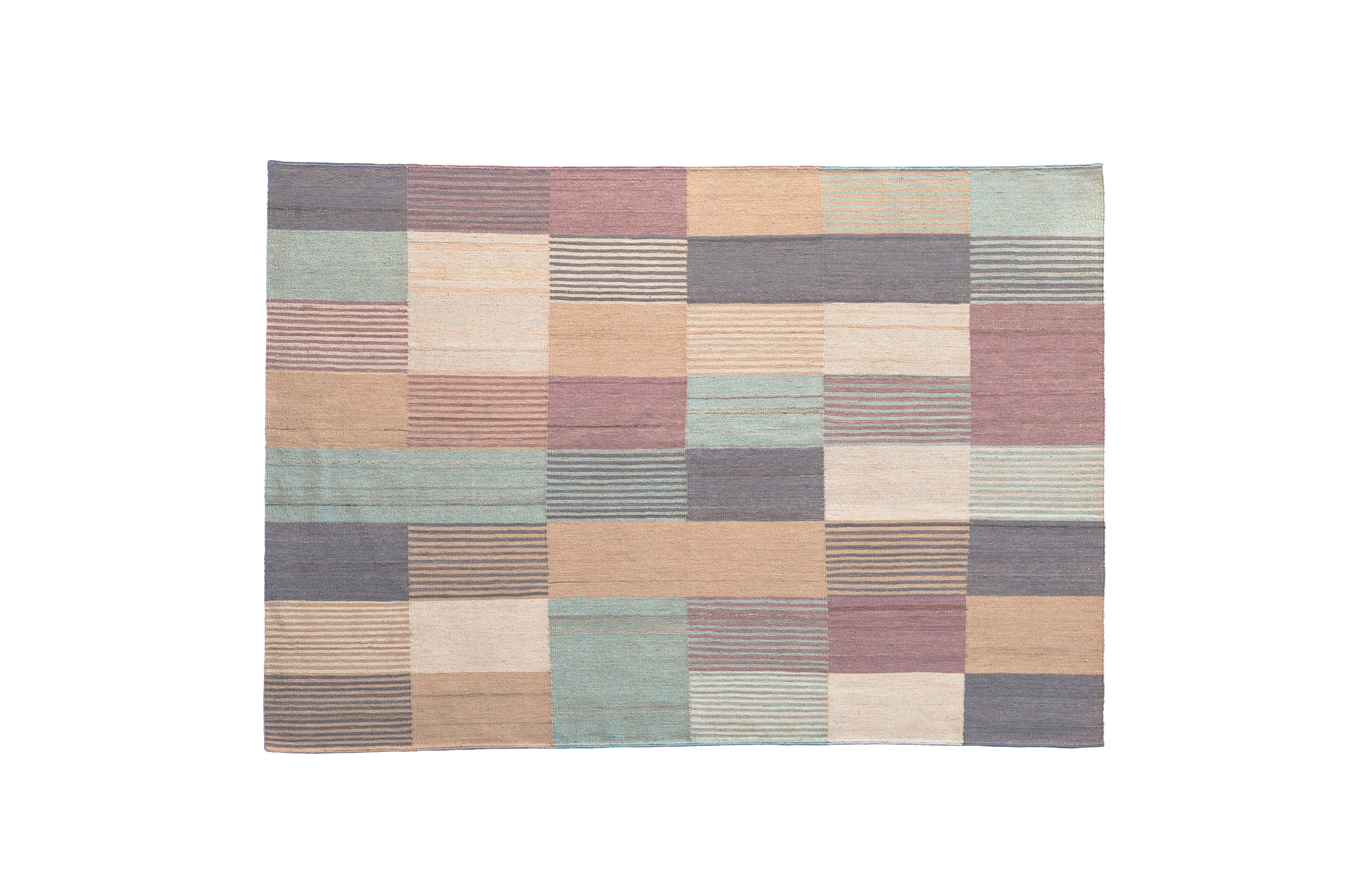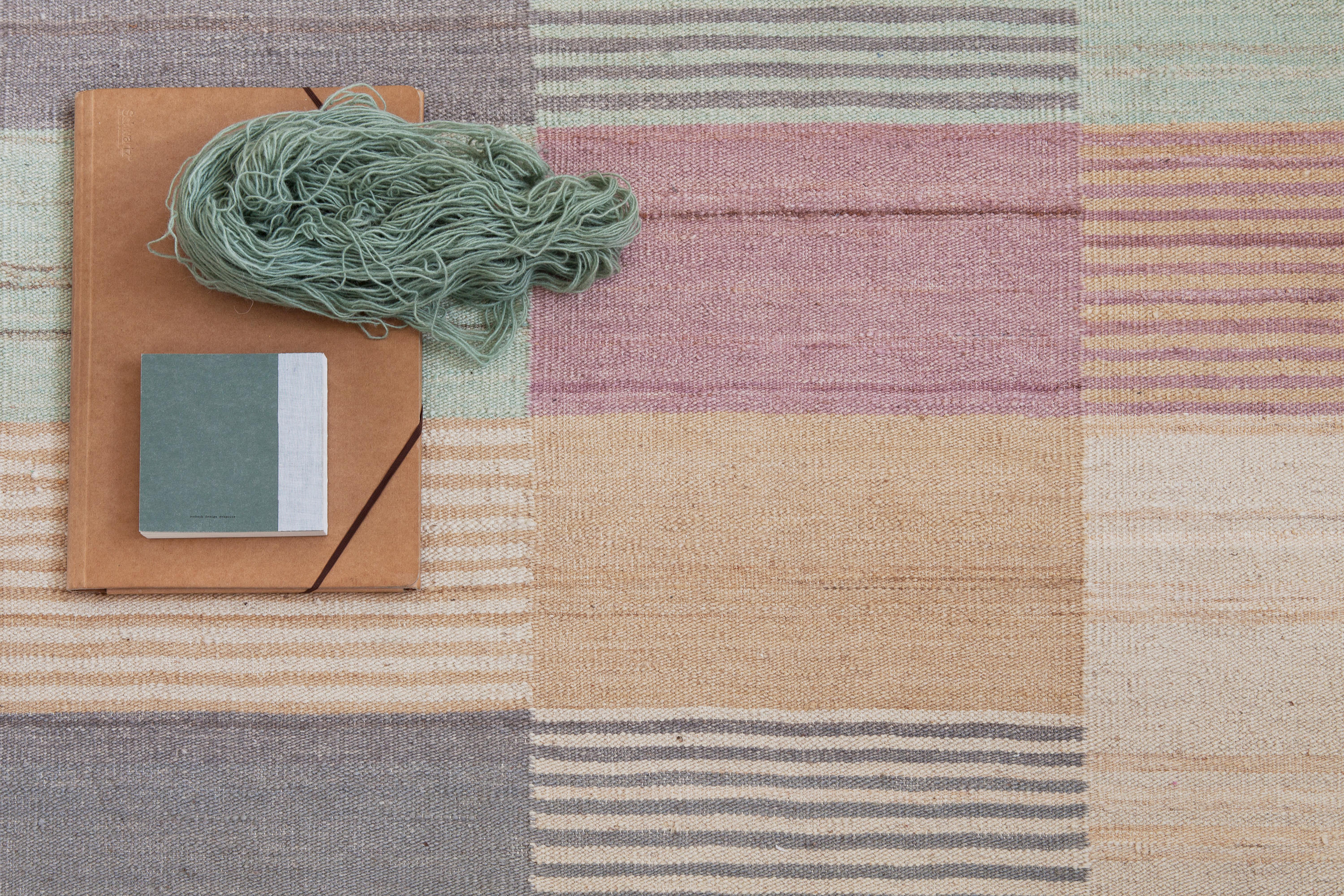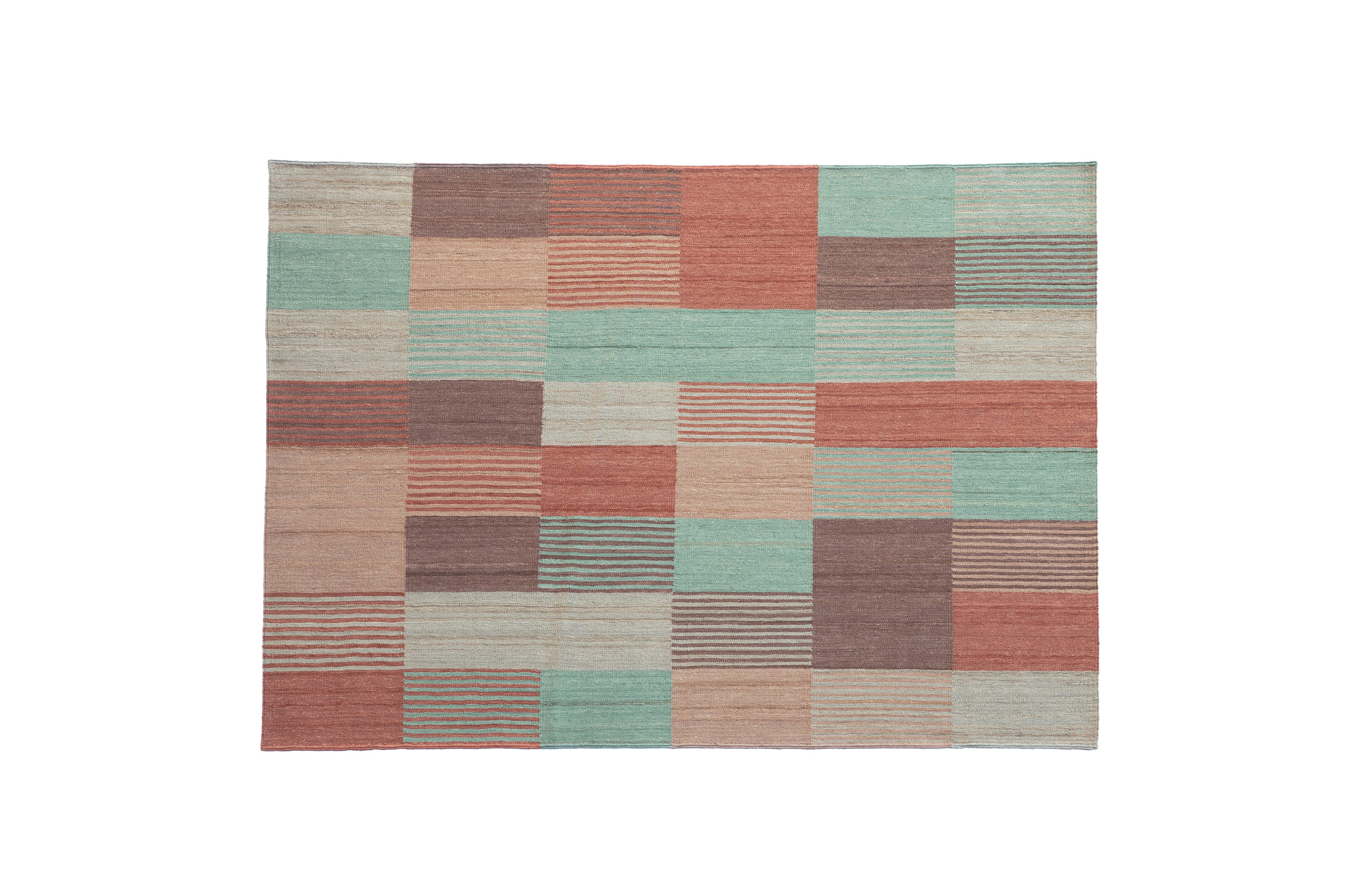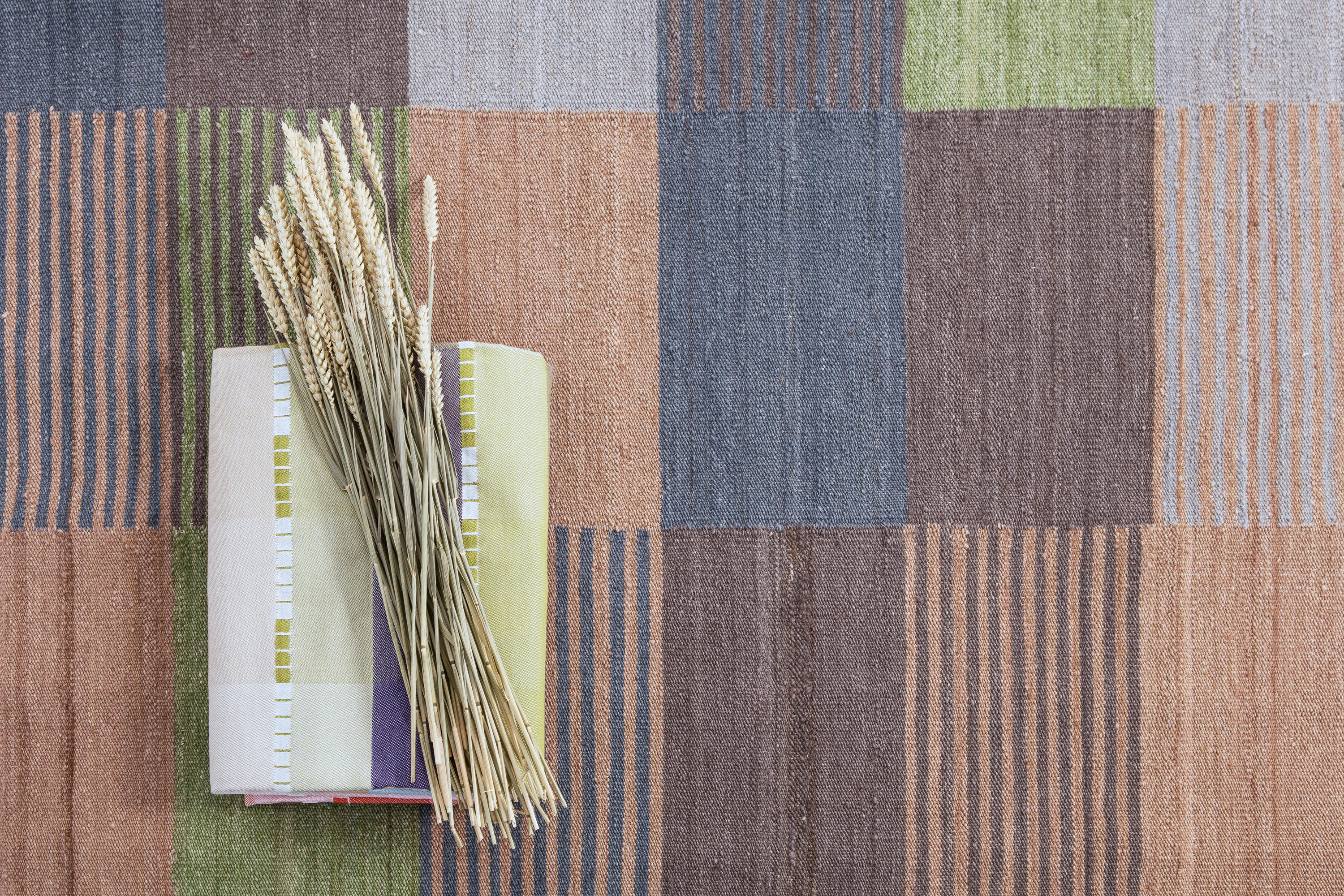 一个纤细的、手工编织的Kilim混纺地毯,应用了色彩理论的基本规则,有三种可用的色调、亮度和饱和度的模型。