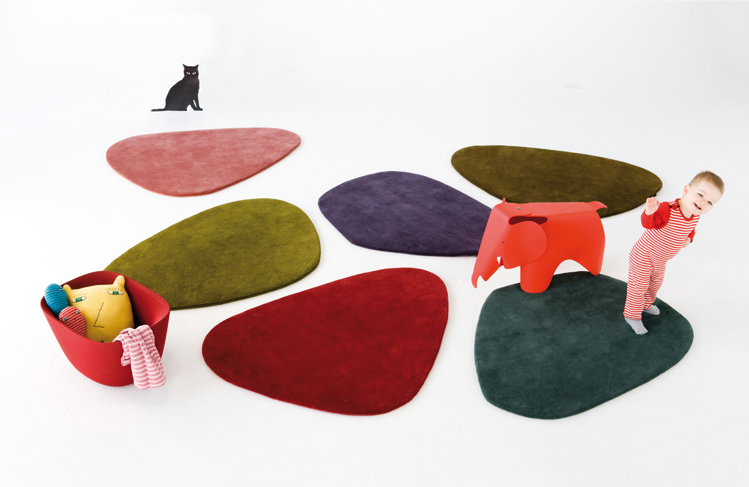 灵感来自亚历山大·考尔德的著名手机,这些不规则的羊毛地毯被认为是生活在一起,形成有吸引力的组合。