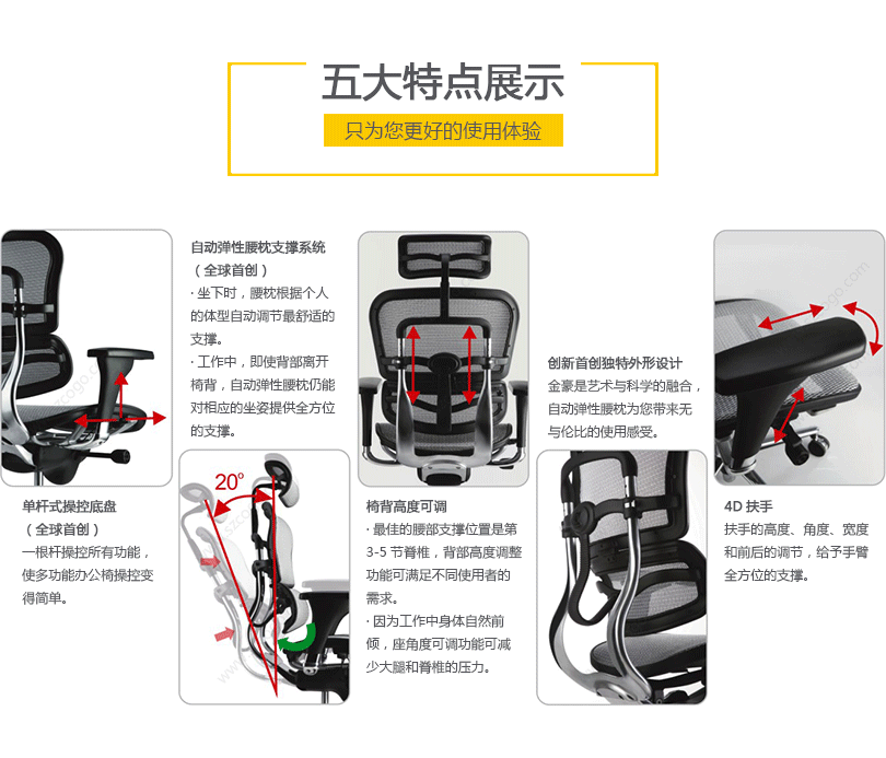 首选专业人性工学椅,保护您的腰;倍受董事长、高阶经理人青睐;商务大气,适用于会议室等商务场所;荣获众多国际影视拍摄使用;全球销量累积超过350000张。"