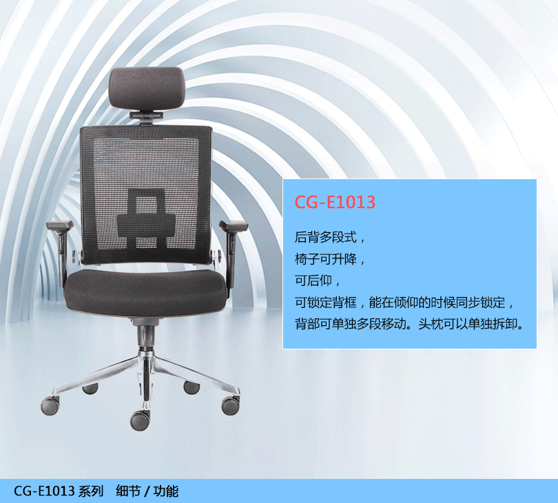 CG-E1013办公椅是一款符合人体工学的全功能性办公椅,力求使用者能充分理解其人性化的设计及达到最舒适的调节。