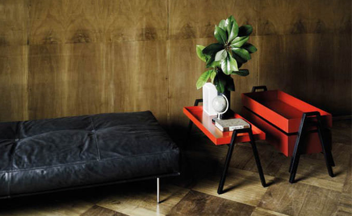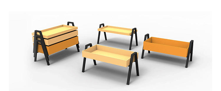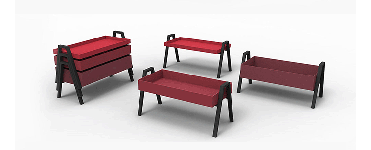 table composed of three containers of different heights in a barrel between them.legs in massello beech lacquered.plans in multilayer containers birch enamelled,set at each base.available in three variants of three colors each.