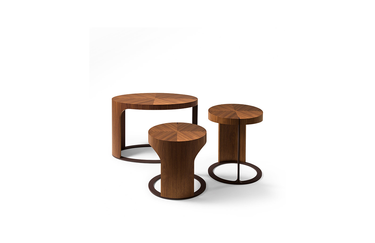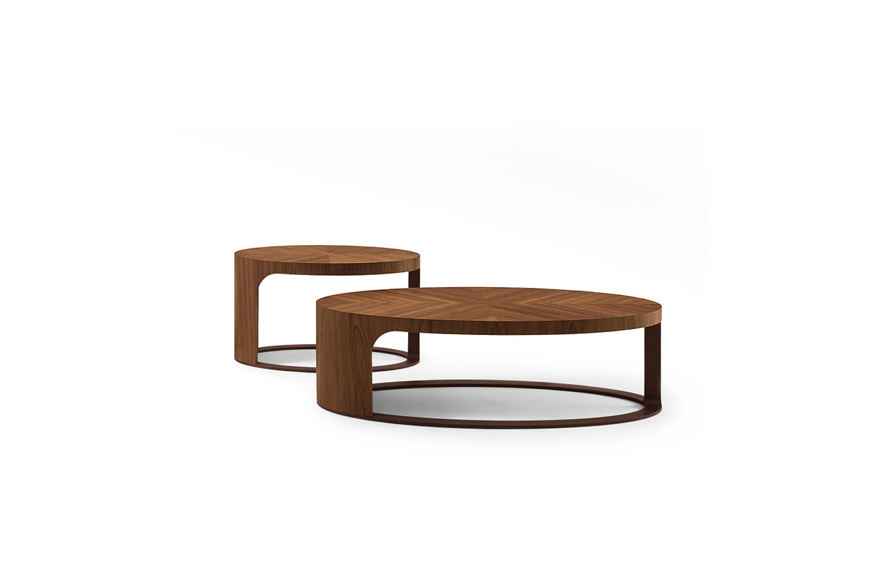 一系列的圆形或椭圆形咖啡桌结构在弯曲杨树胶合板、单板在核桃卡纳莱托木(fin.11)和青铜色金属画.