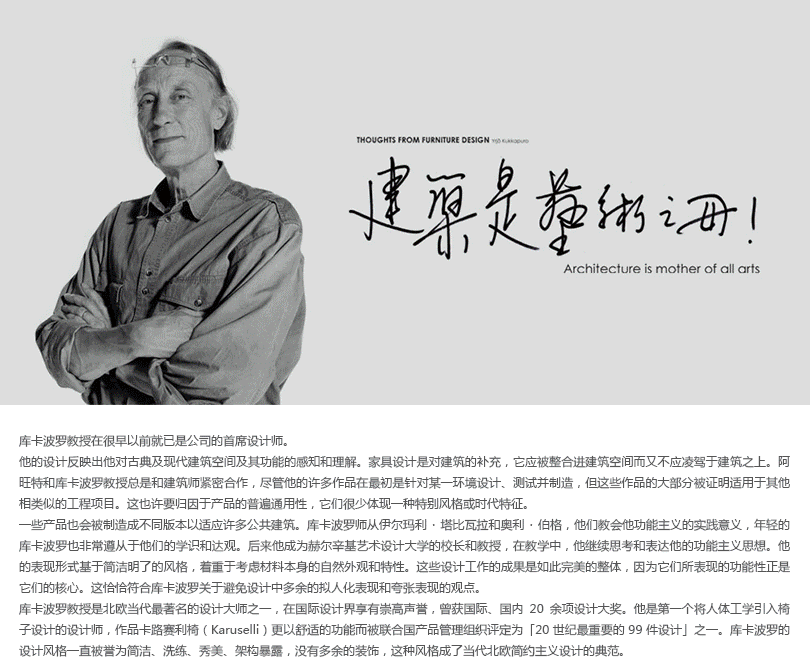 该设计特点包括精致、简单以及多样性。材料、色彩、构造等的多样化使得沙发有许多变体,独创的结构也使其具有多样性,可根据需要和设计原则来进行自由组合,配件的标准化使它利于制造、包装、装配和运输。