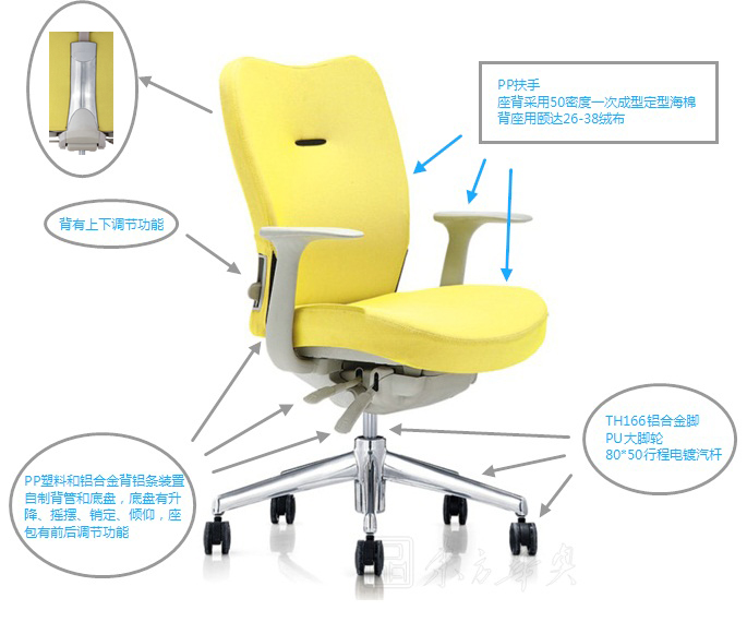 A:用TH166PP扶手,TH166铝合金脚,PU大脚轮,80*50行程电镀汽杆。背有上下调