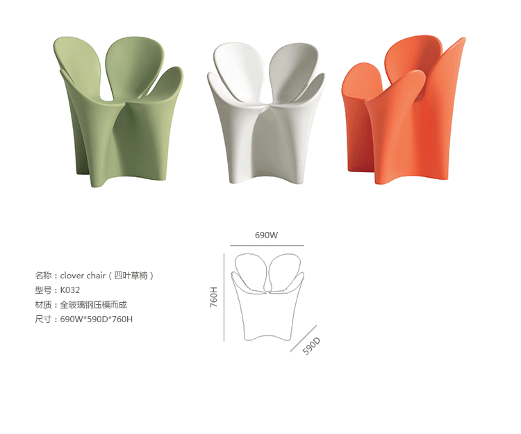 花辨椅(CLover Chair)是由著名的英国设计师Ron Arad设计的,作为上世纪中期现代风格的设计师,Ron Arad是优秀的,花辨椅(CLover Chair)也叫三叶草椅,在意大利家具品牌Draide在2007米兰家居展上出现了花辨椅(CLover Chair)。 三叶草象征着爱情、健康、名誉和财富。三叶草也叫幸运草,传说中幸运草之名是源自拿破伦,一次他正带兵行过草原,发现一株三叶草,甚觉奇特,俯身摘下时,刚好避过向他射来的子弹,逃过一劫,从此他便称三叶草为幸运草。辗转流传三叶草已经被国际公认为幸运的象征。它的三片叶子分别代表着爱情、健康、名誉及财富,拥有它将为您带来好运。