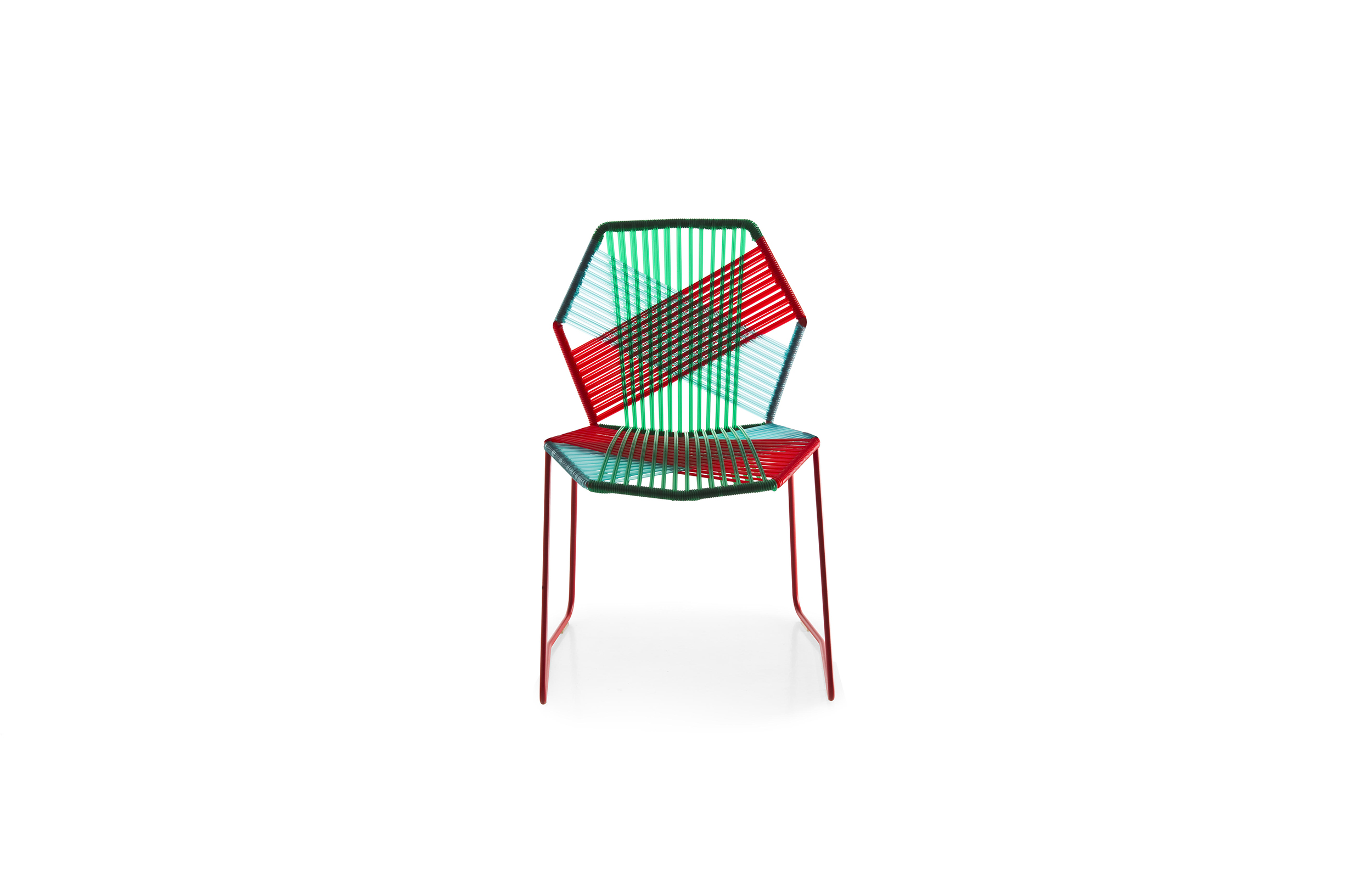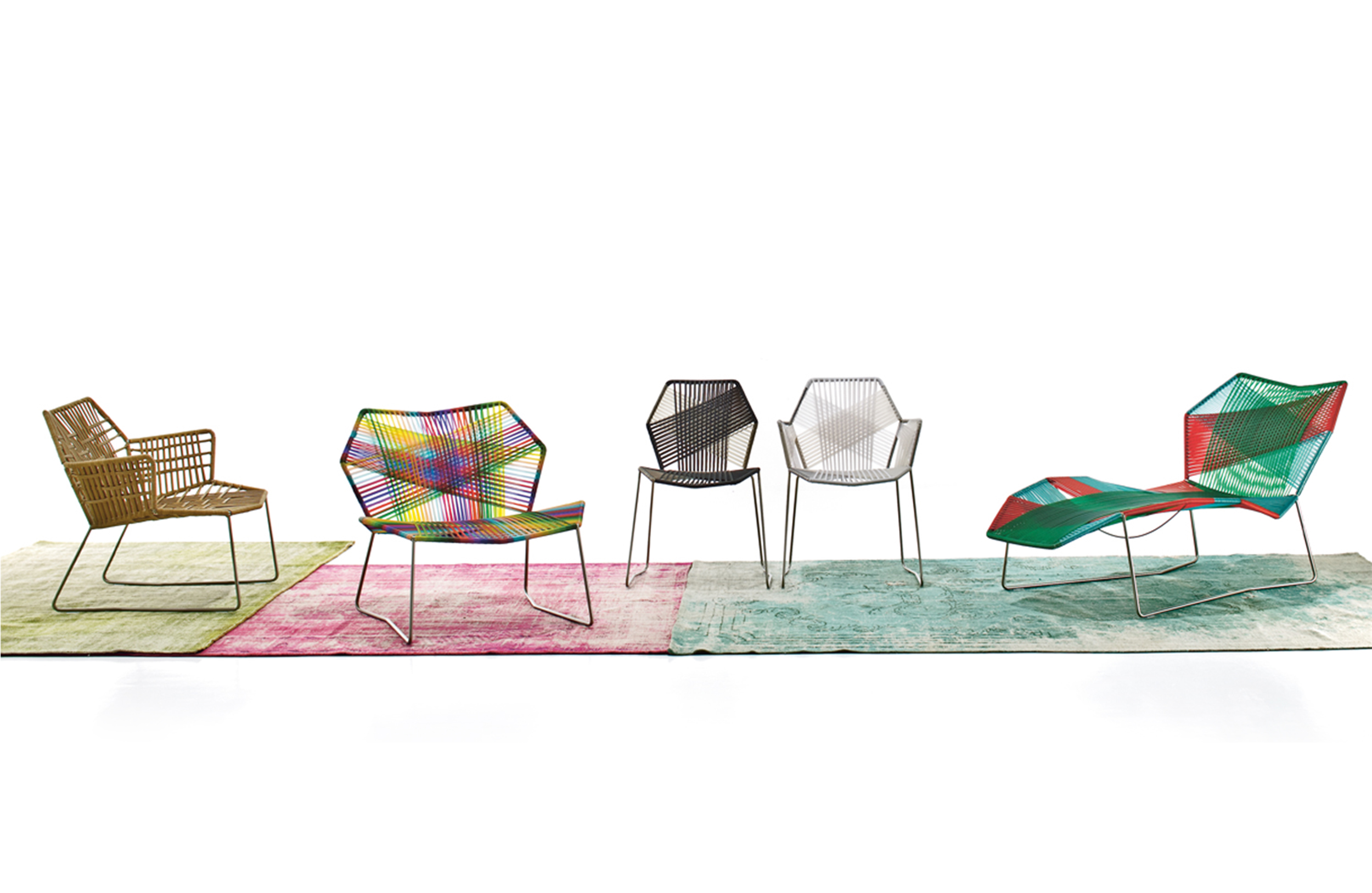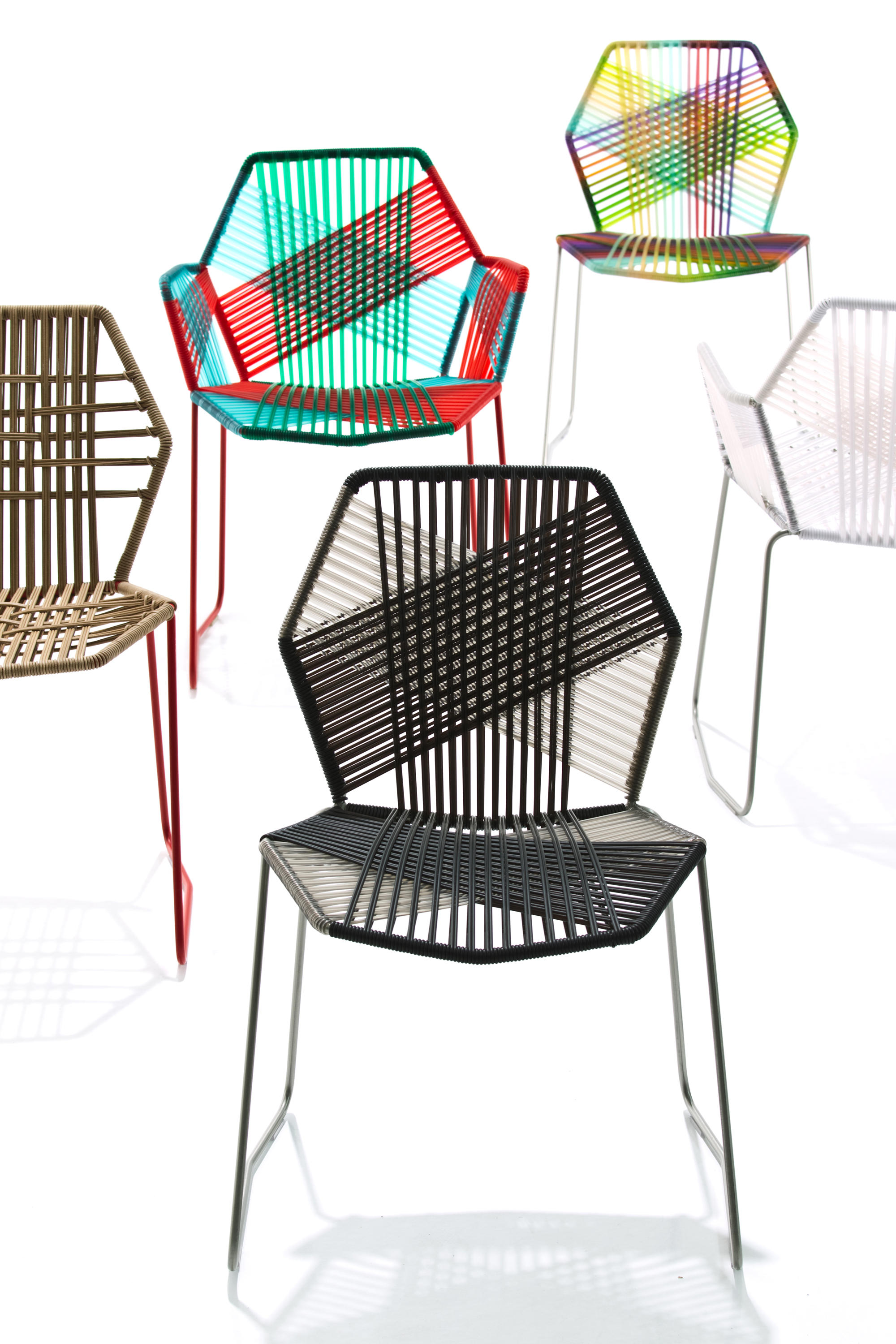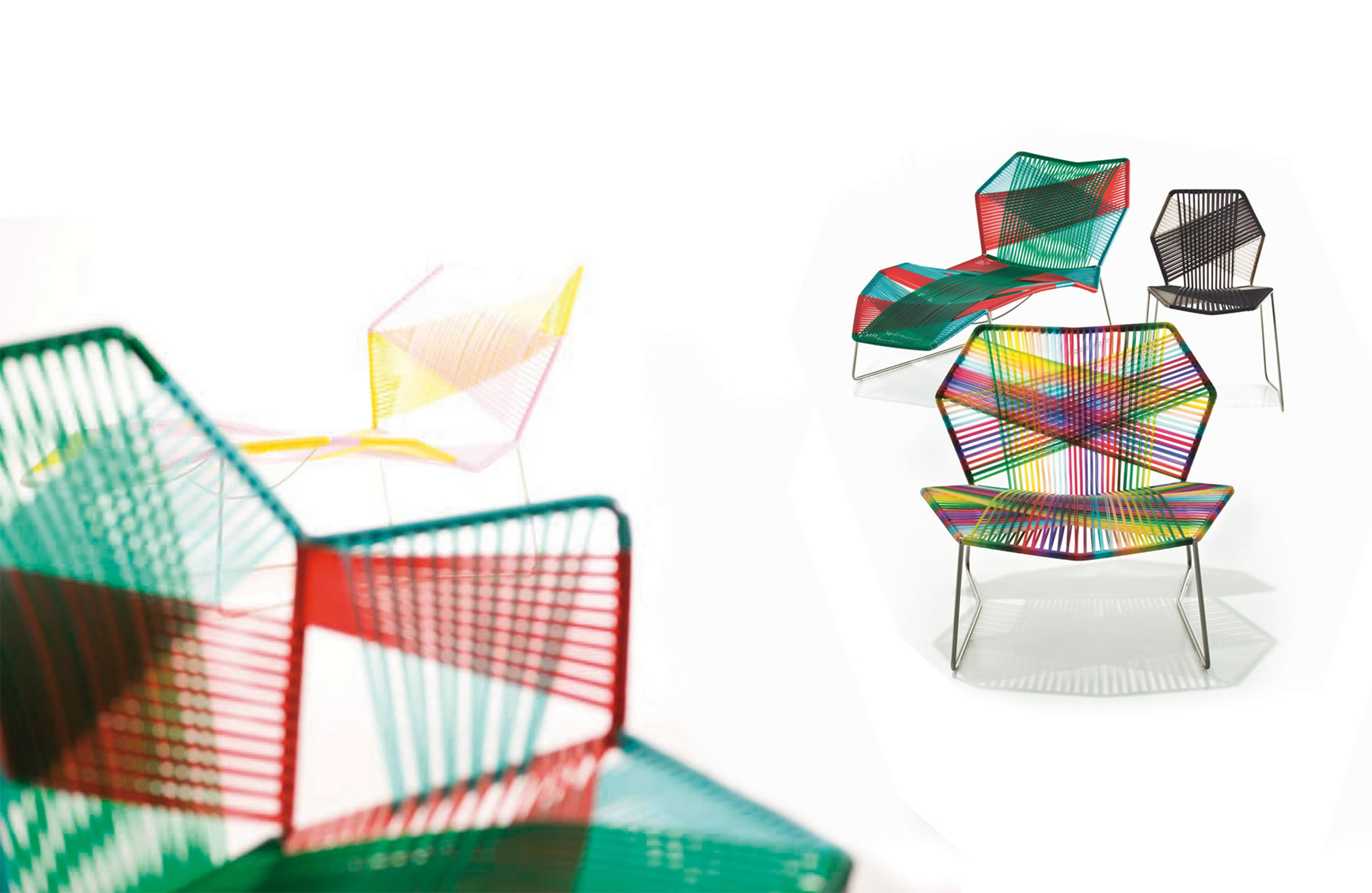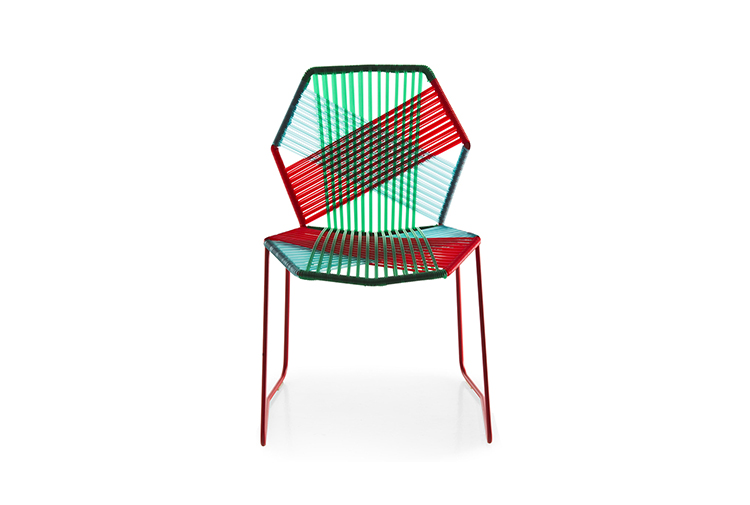 安蒂博迪(Antibodi)的钢管框架成为设计师用于创意改造的起点。框架被包裹和变换,座位根据所使用不同颜色的材料呈现不同的个性。两到三种颜色的线条以螺旋的方式将钢管包裹起来,形成了一种有趣的颜色复杂的设计。