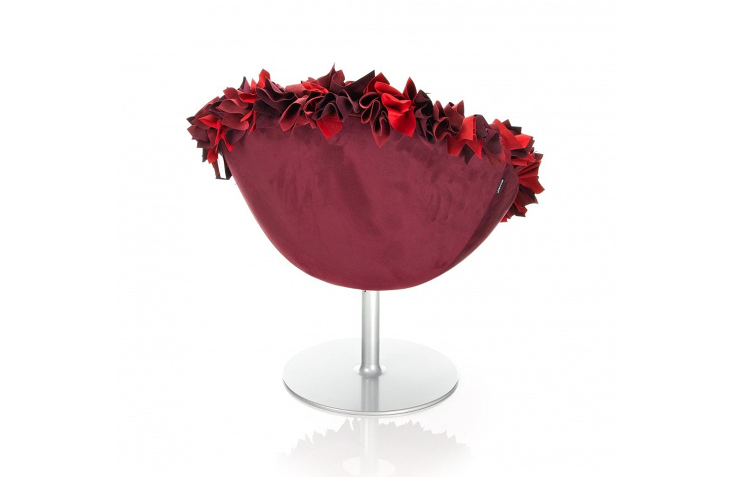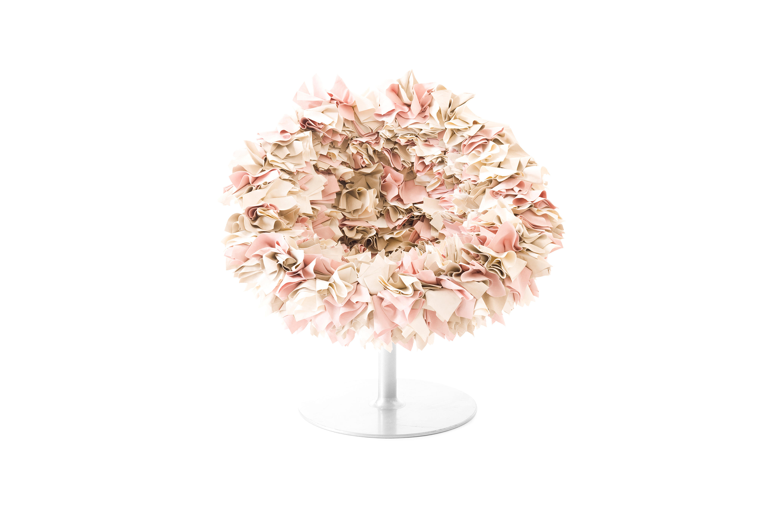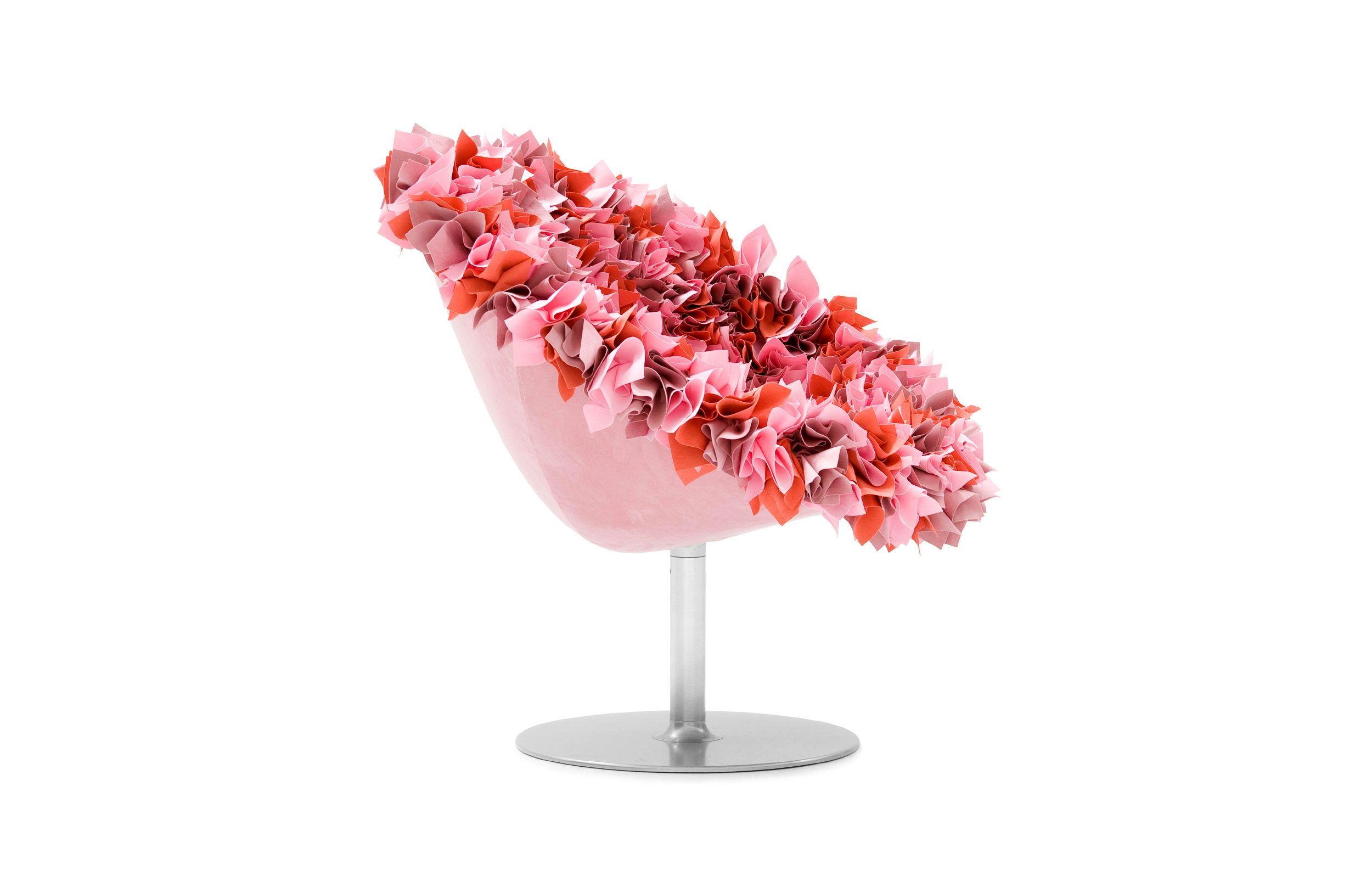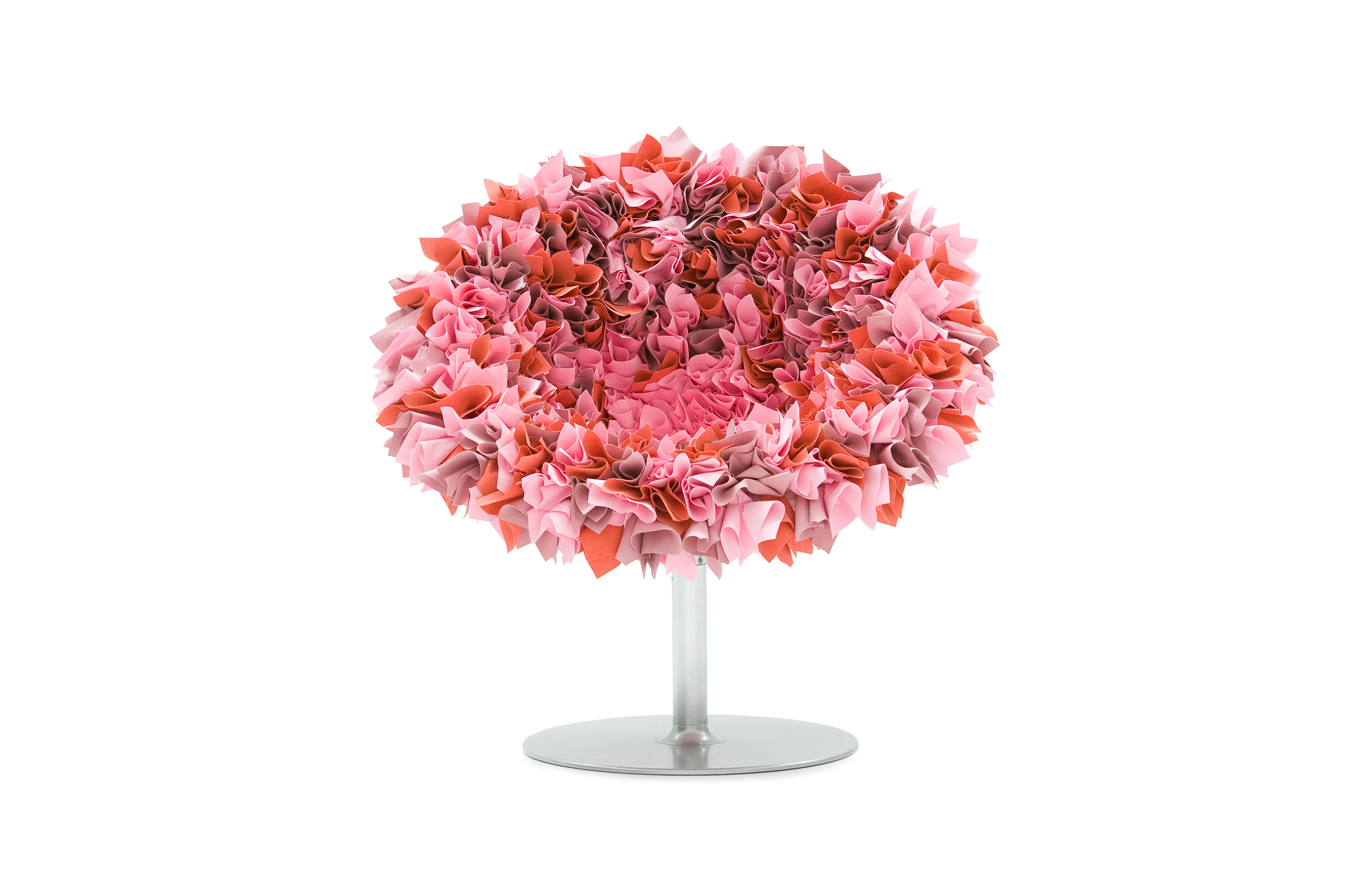 如纤细的镀铬金属茎上,绽放出一束花瓣,花瓣由一块块的织物组成,这些织物是用熟练的双手和无限的耐心一一折叠和缝制的。这是对精神美的一种赞颂,这种美存在于一个简单的重复动作中,揭示了视觉和真实形象之间的界限。花瓣的外皮包裹着鸡蛋形状的贝壳,直到所有的内部都被覆盖。梦幻的寓言,在工业设计的对象中颂扬的复杂的诗意转换。这把椅子让坐在上面的每个人都很开心,就像一束花一样。