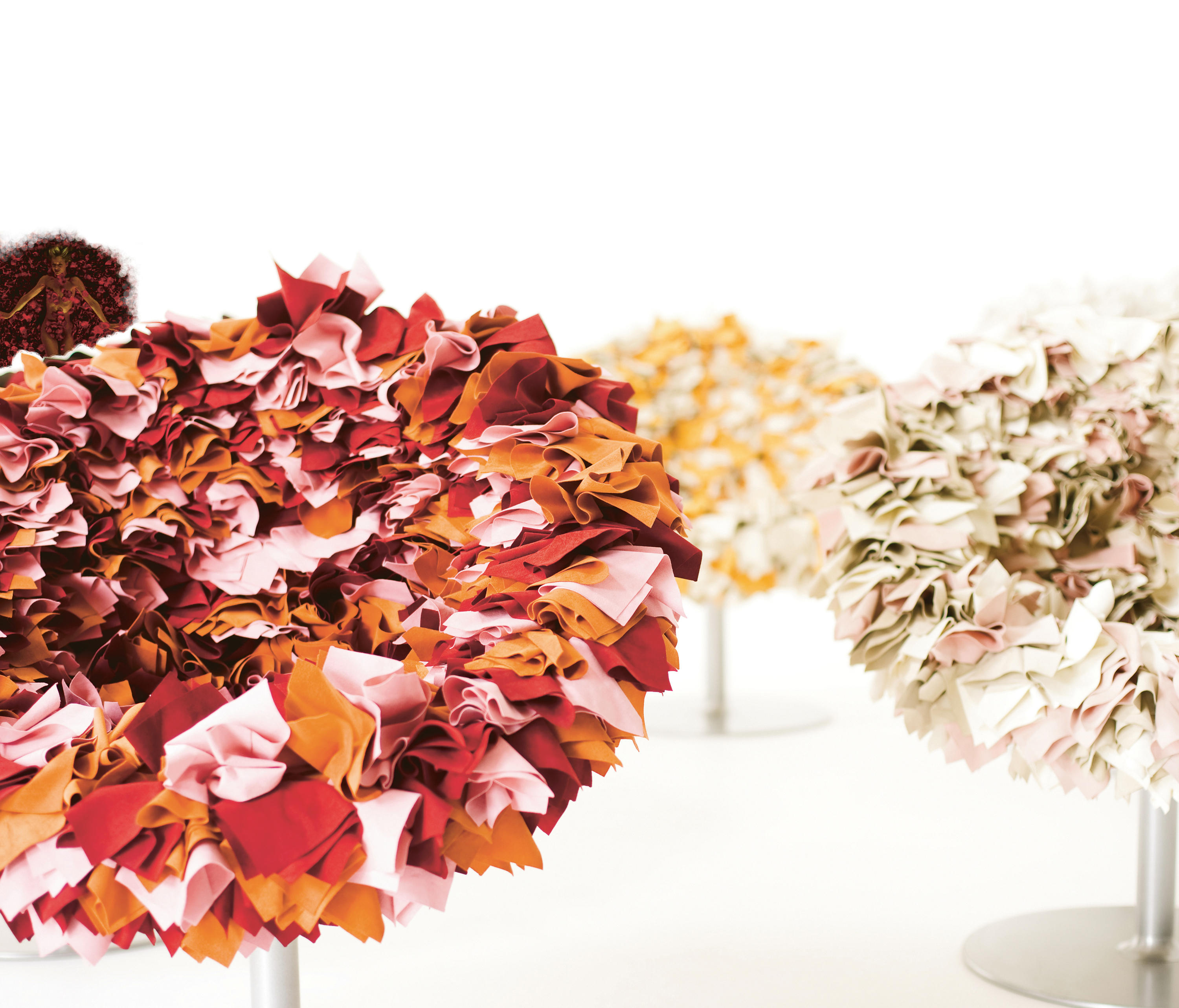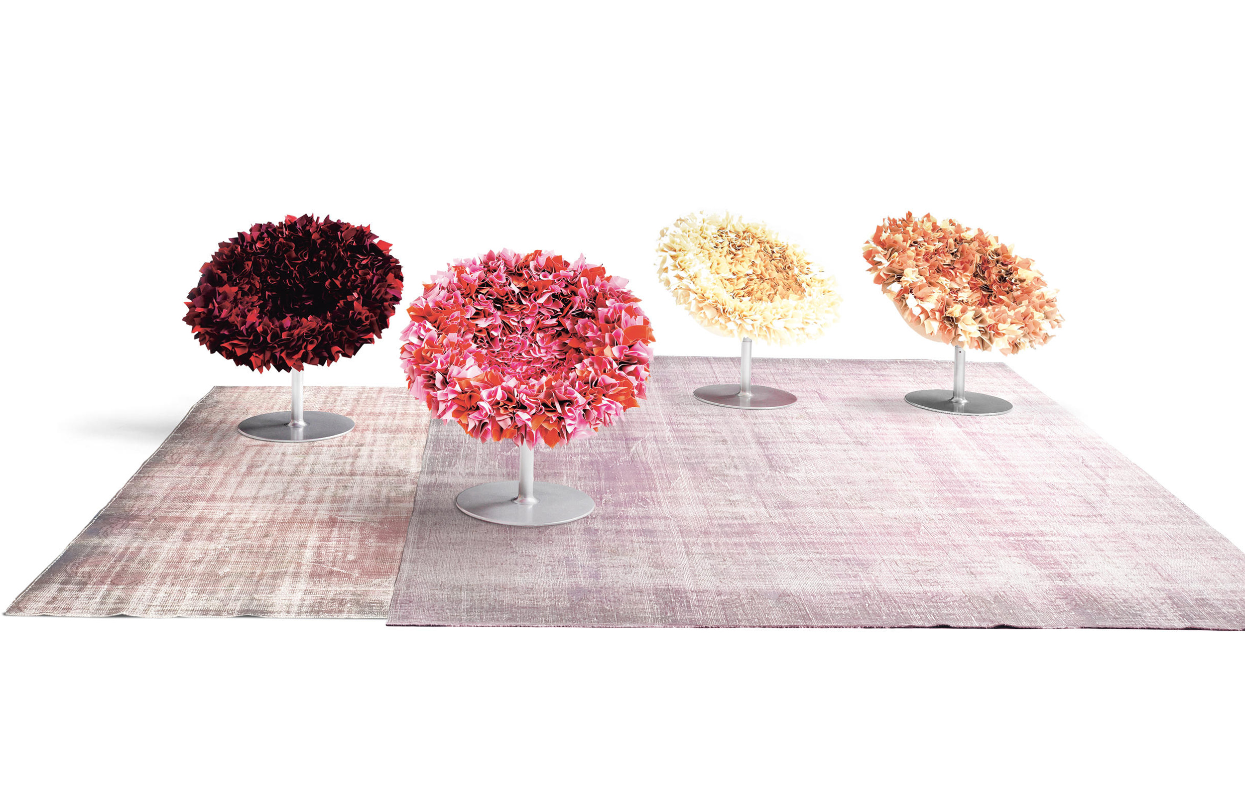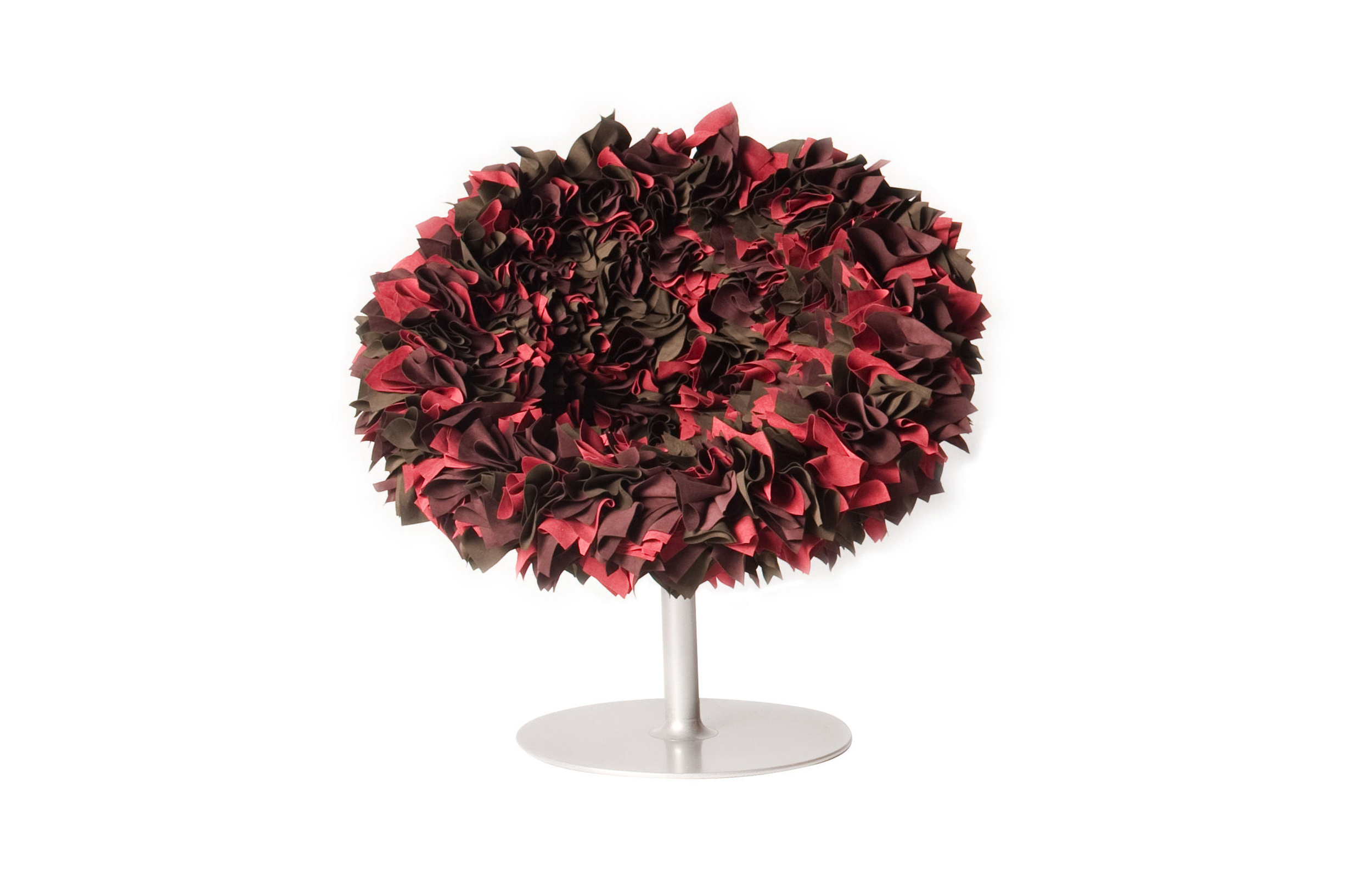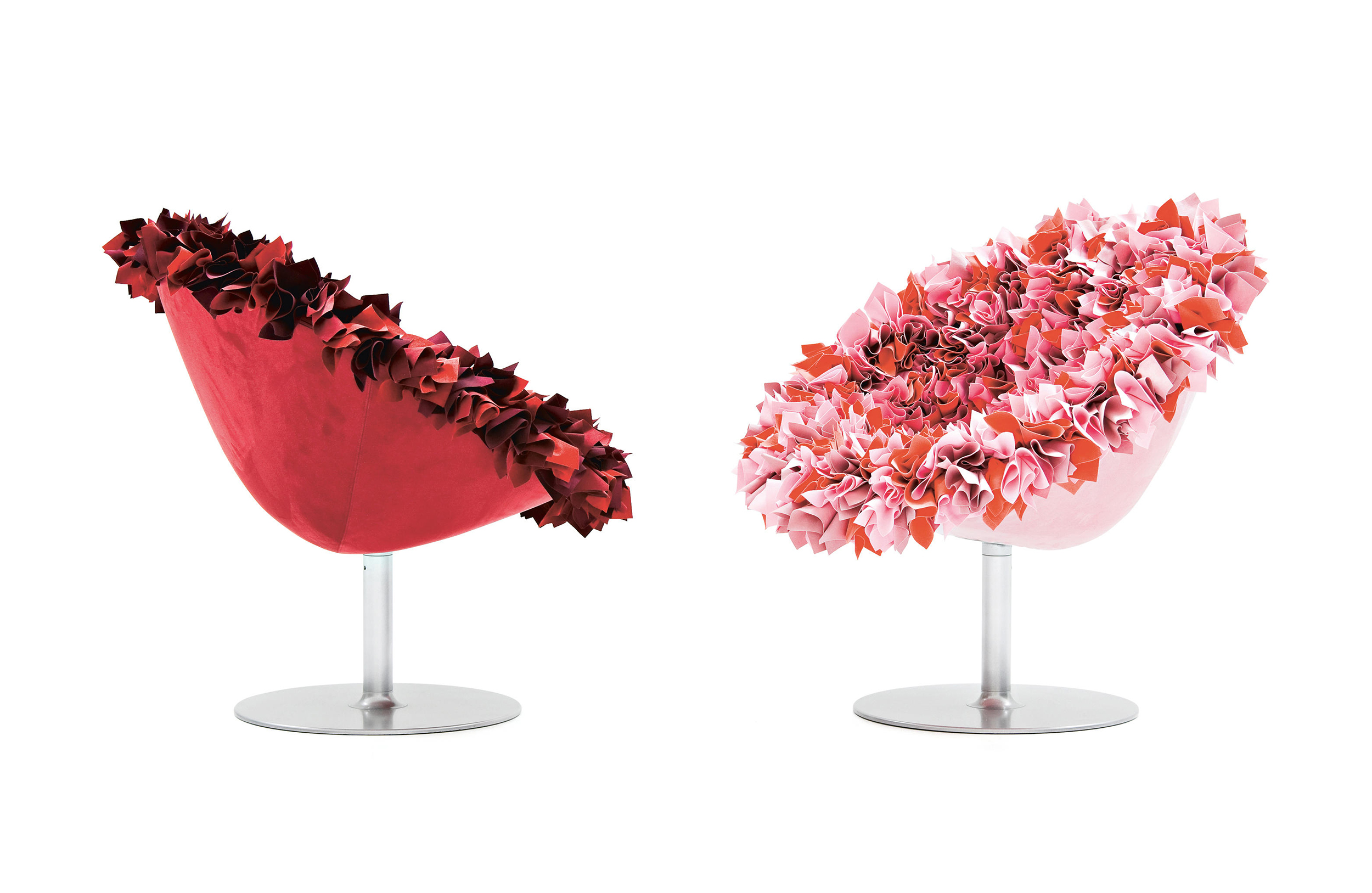 如纤细的镀铬金属茎上,绽放出一束花瓣,花瓣由一块块的织物组成,这些织物是用熟练的双手和无限的耐心一一折叠和缝制的。这是对精神美的一种赞颂,这种美存在于一个简单的重复动作中,揭示了视觉和真实形象之间的界限。花瓣的外皮包裹着鸡蛋形状的贝壳,直到所有的内部都被覆盖。梦幻的寓言,在工业设计的对象中颂扬的复杂的诗意转换。这把椅子让坐在上面的每个人都很开心,就像一束花一样。
