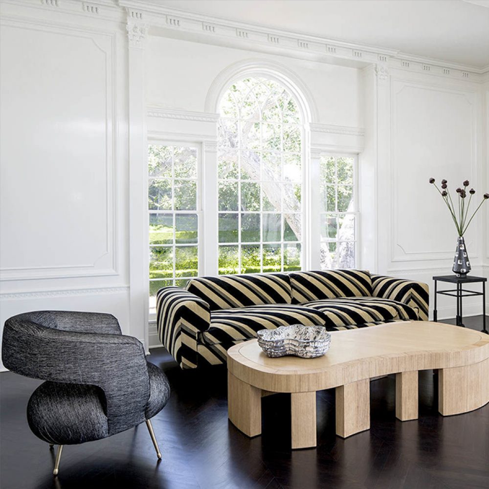 大胆的无定形罗德咖啡桌采用整体式黑檀木和拉丝橡木框架,与实心四分之一木质顶部和整体式腿部的光滑表面形成鲜明对比。