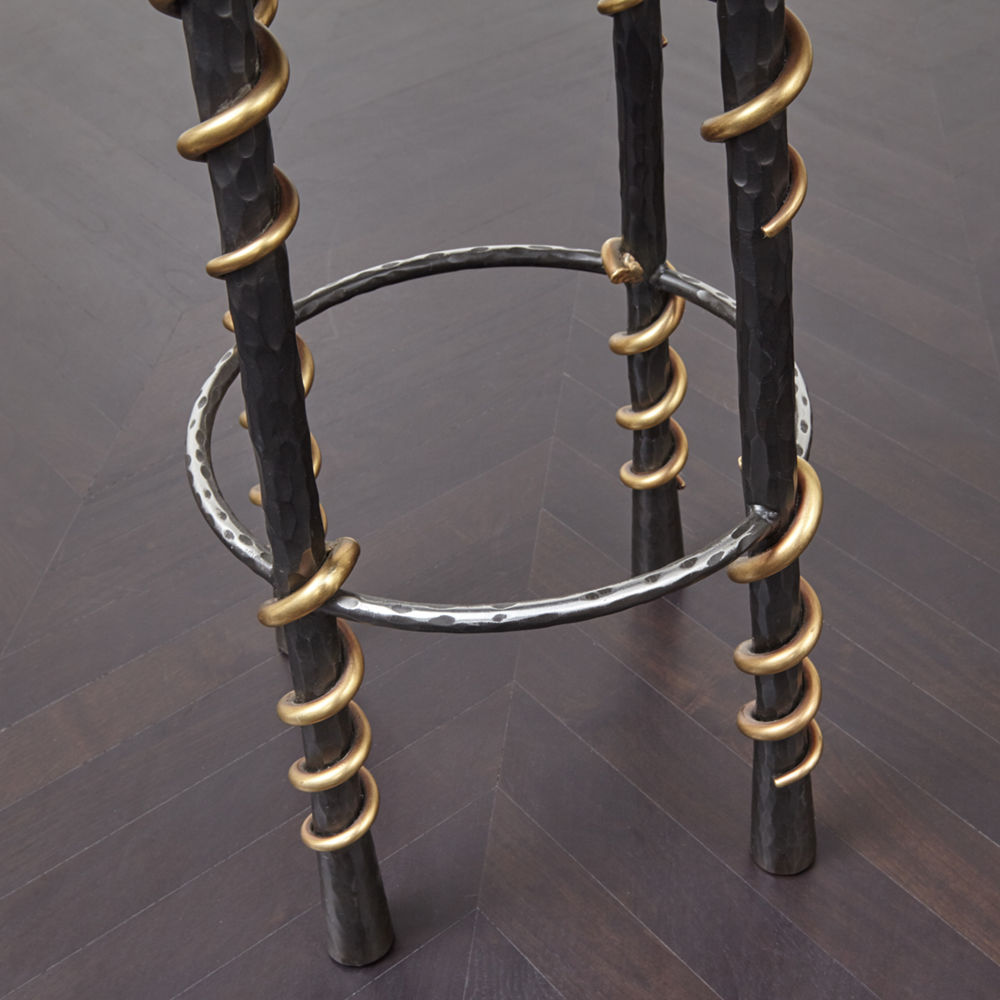 这款性感而简约的凳子采用手工锻造的黑色钢制成,并配有青铜蛇纹细节。 每个坚实的,切片雕刻的腿都是手工涂抹的深油擦青铜色。 座椅采用柔软的黑色纹理皮革装饰。 Serpent Stool采用黑色手工锻造钢材制成,可以采用各种纹理,奢华皮革装饰。