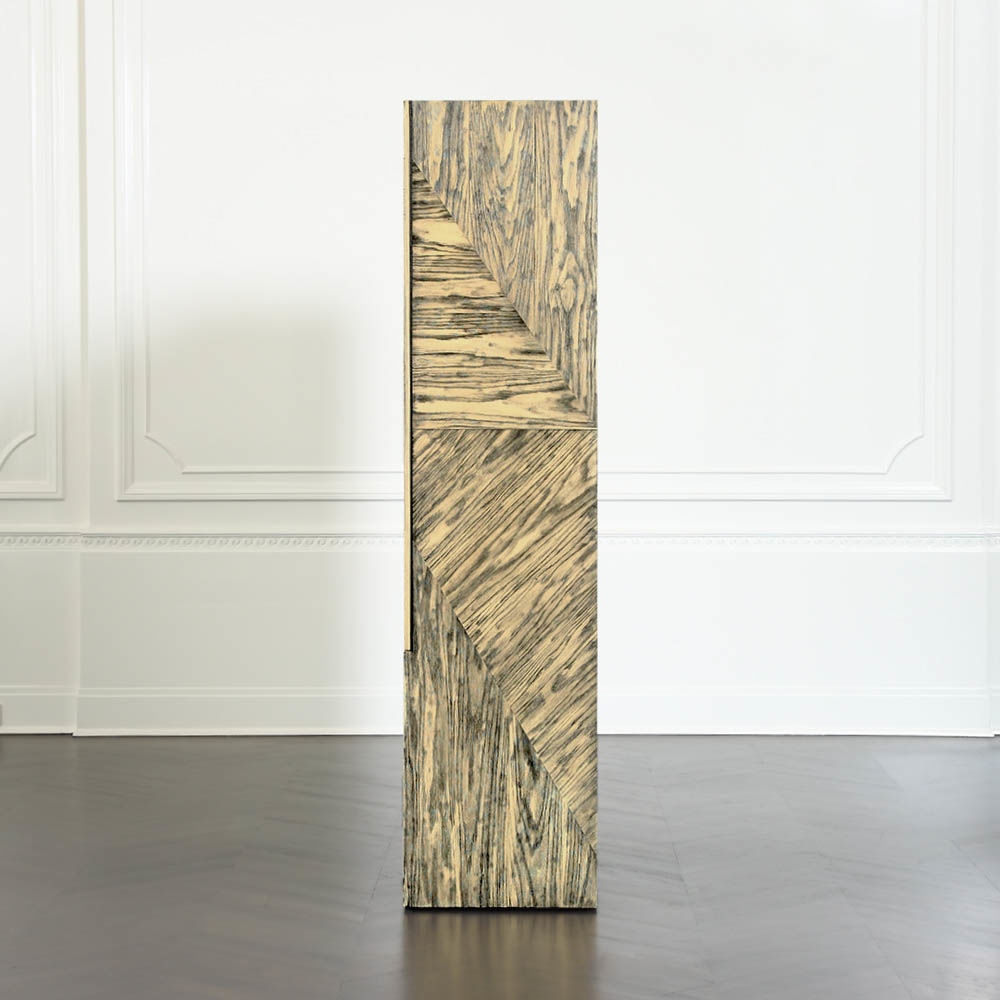 Esker柜是一个图形和现代的存储或媒体显示的选择。这个棱角分明的轮廓是由淡黄色和黑色的橡木切割而成。对比鲜明的污渍,随机定向的镶板,和橡木的纹理运动结合在一起,最大限度的视觉冲击。在Z折叠门后面,室内提供了8个内衬抽屉,黑色的钢五金件和两对可移动的实木架子。