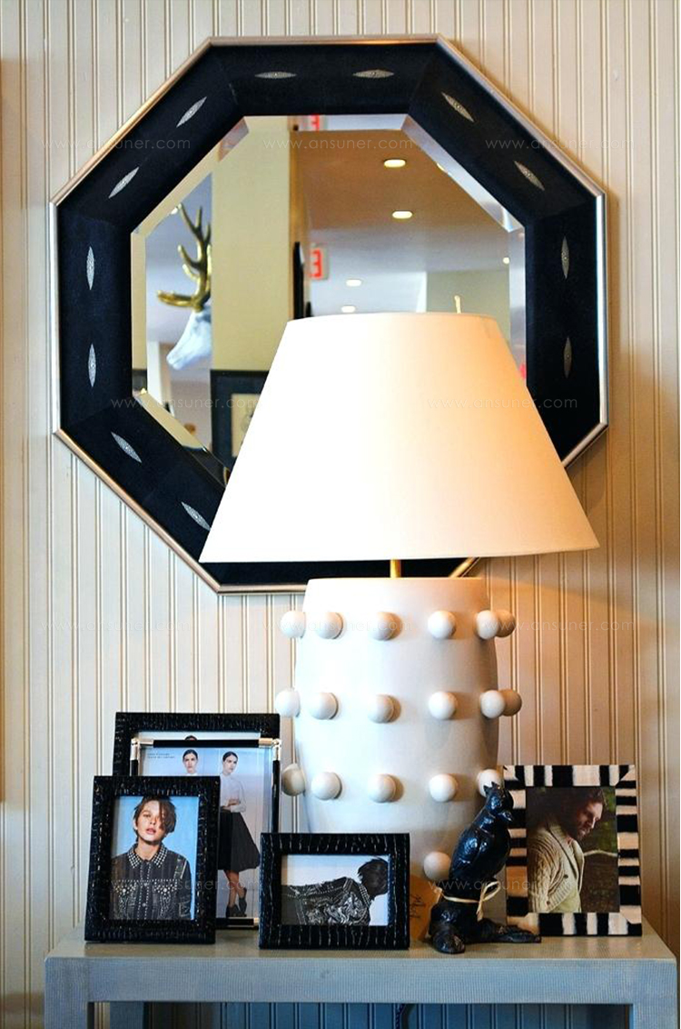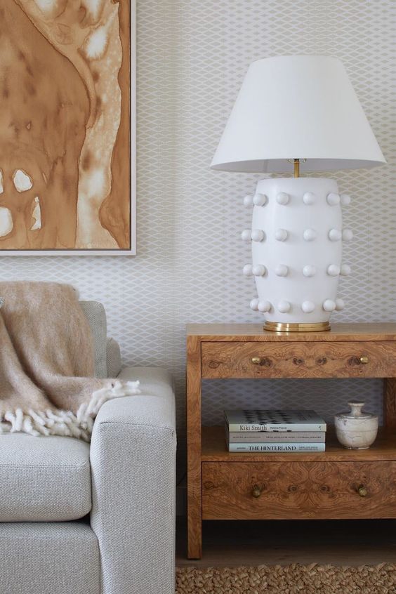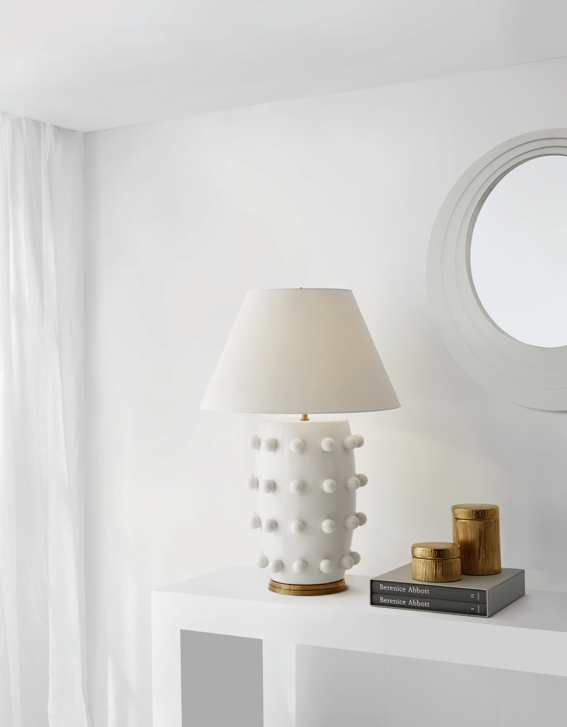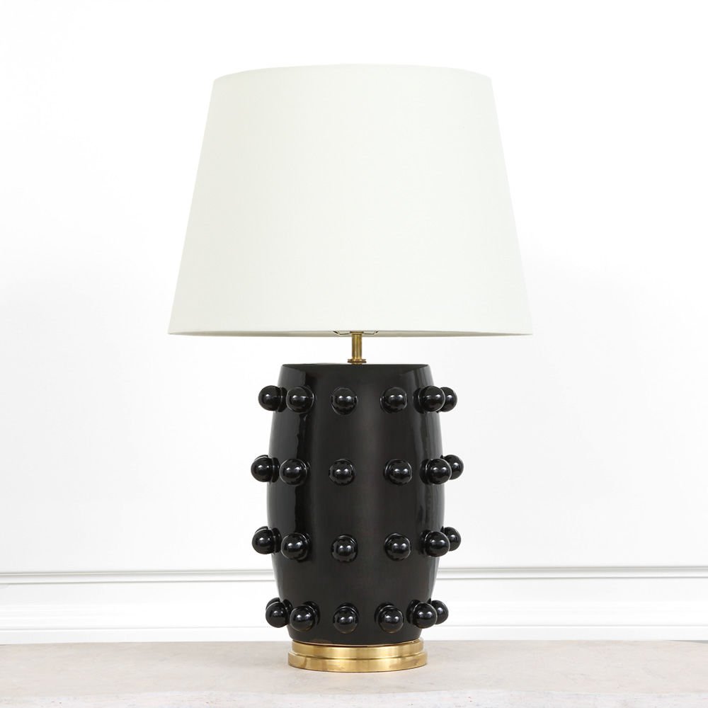 Linden台灯采用精美雕刻的陶瓷底座上的重复装饰球体,充满趣味与精致的对比。 这款台灯采用亚麻色调,古董抛光黄铜细节,并采用黑色或白色石膏饰面。