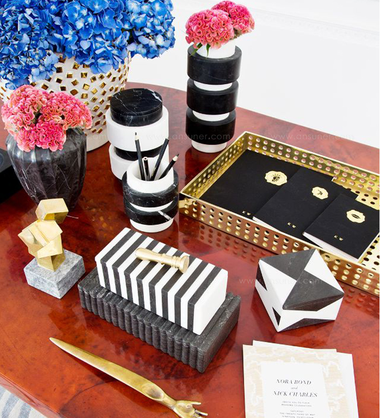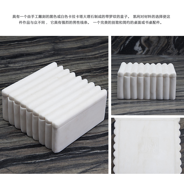 具有一个由手工雕刻的黑色或白色卡拉卡塔大理石制成的带罗纹的盒子。凯利对材料的选择使这件作品与众不同,它具有强烈的男性线条。一个完美的别致和简约的桌面或书桌配件。