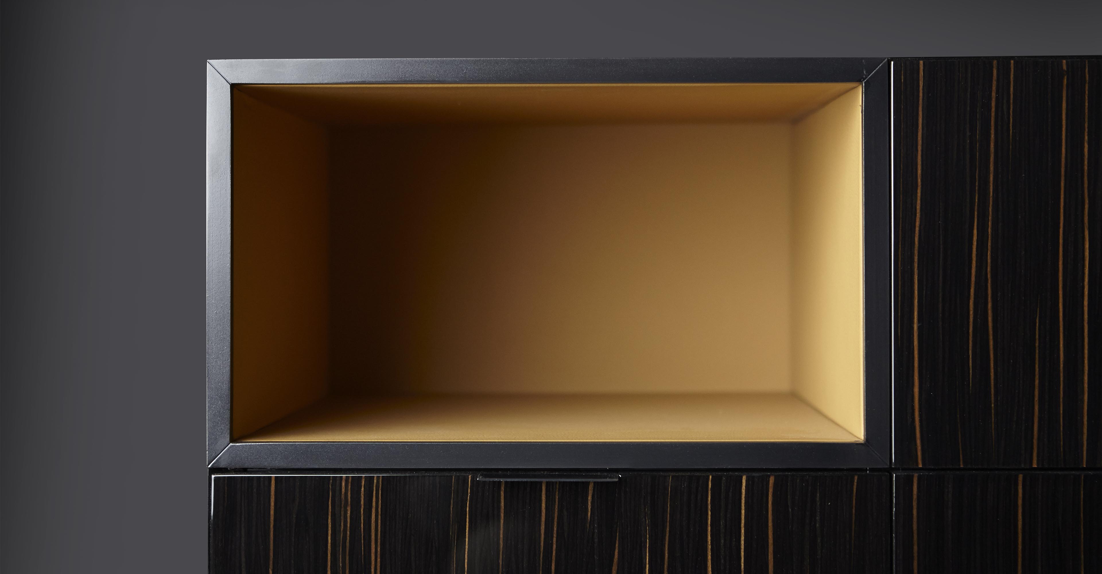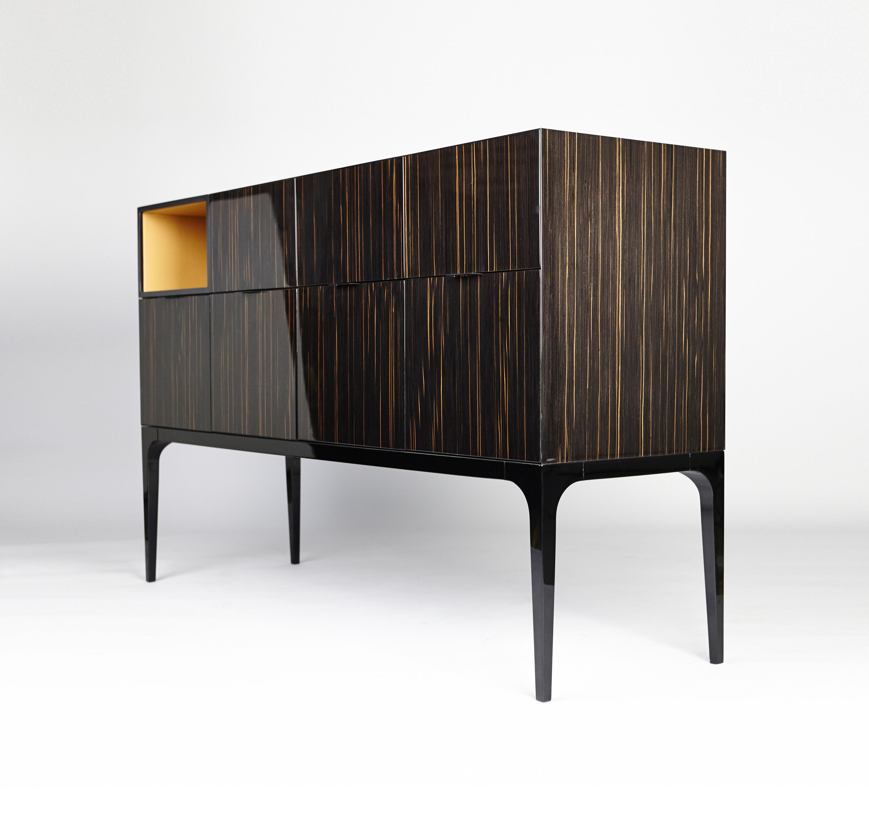 Madia由乌木制成,有七个抽屉和一个开放空间,支撑和镍镀锌金属框架。 利基用皮革覆盖。