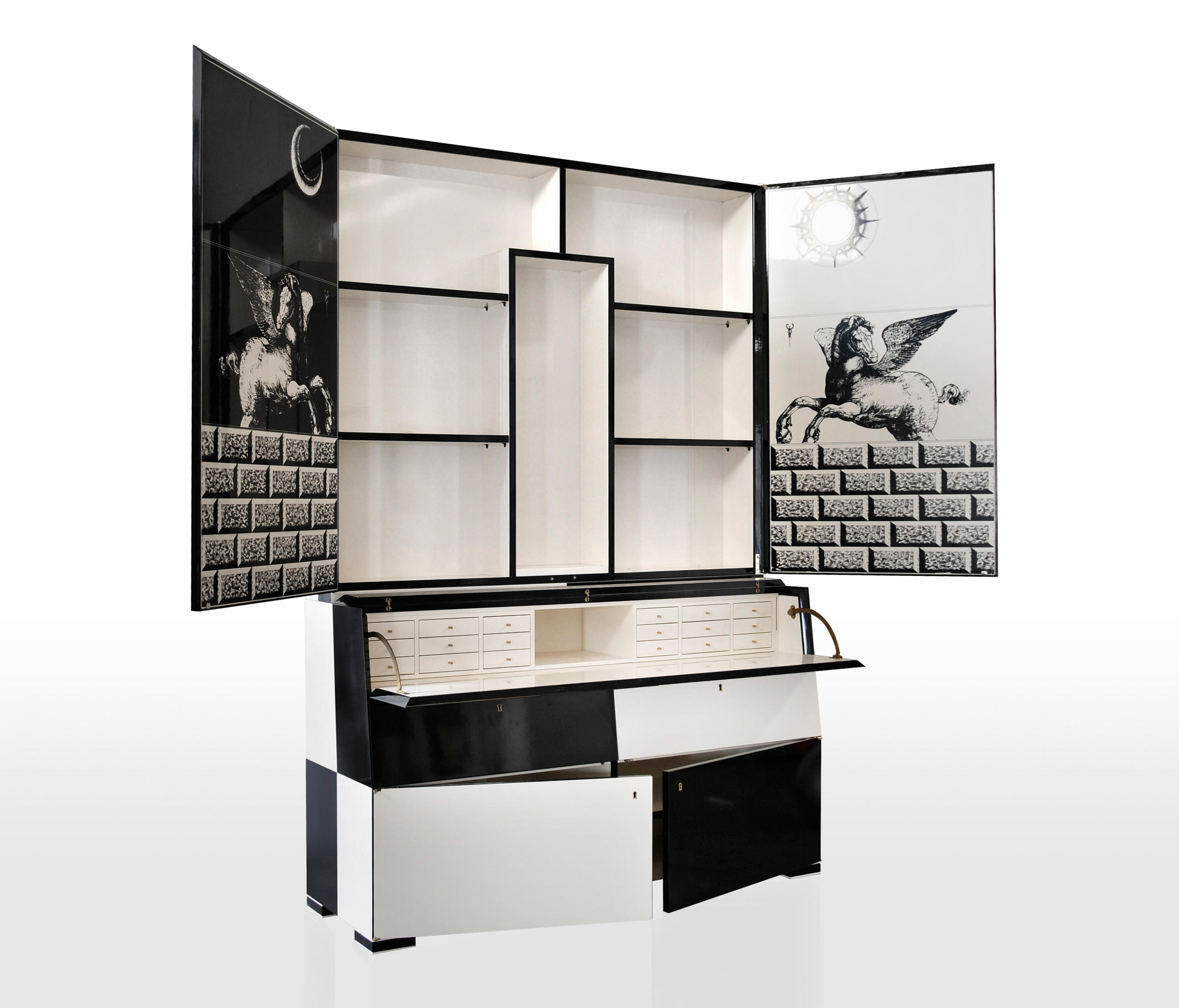 外部采用光泽漆面,内部包括丝网印刷,适用于铣制门的表面,采用双色光泽装饰漆面装饰,可隐藏货架,抽屉和折叠货架。