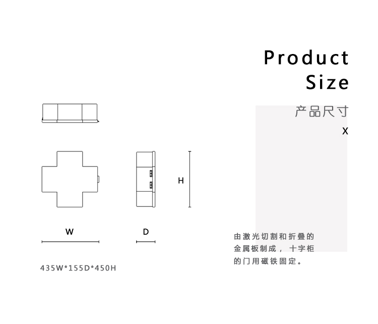 由激光切割和折叠的金属板制成,十字柜的门用磁铁固定。