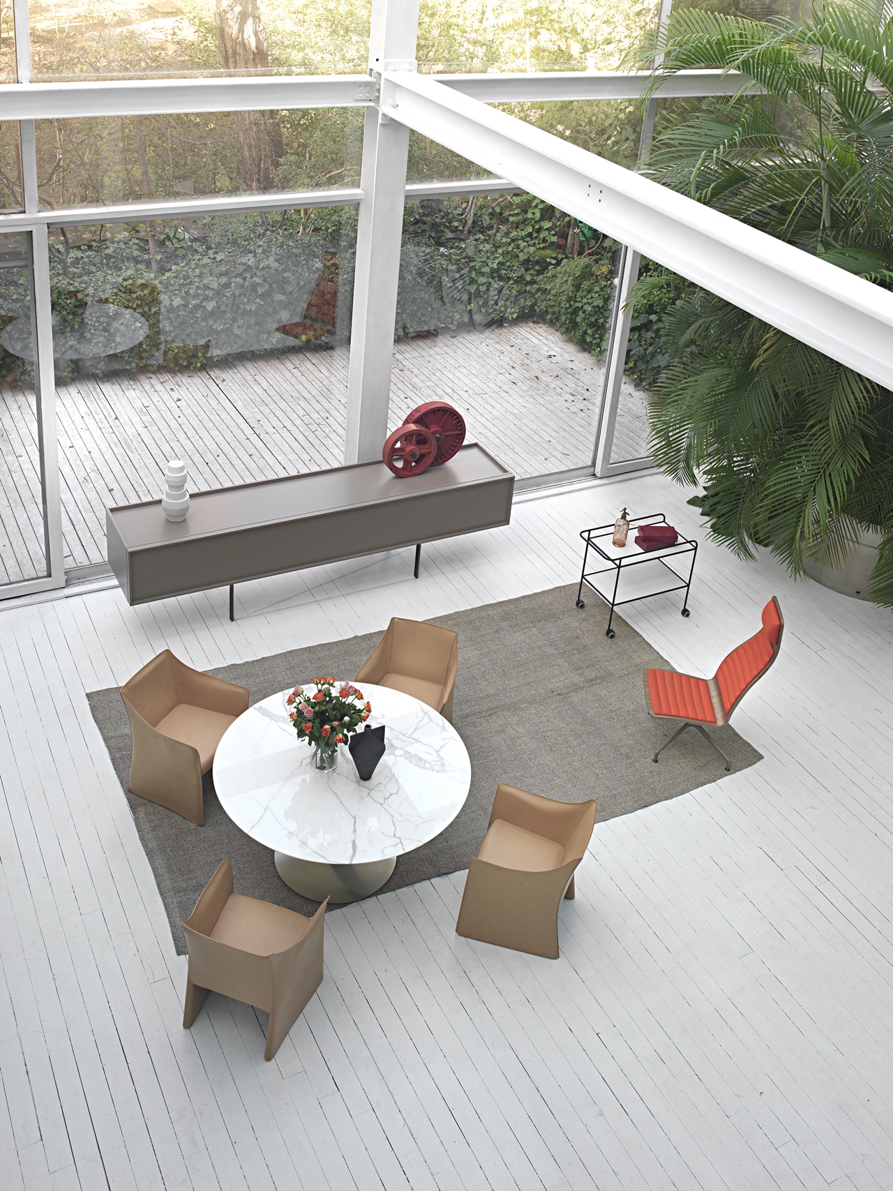 餐桌采用缎面或哑光漆面不锈钢制成,白色或无烟煤色,顶部采用macroter或光面漆木,所有颜色,天然橡木,雕像大理石。 底座完全可拆卸,顶部可以是圆形或方形。