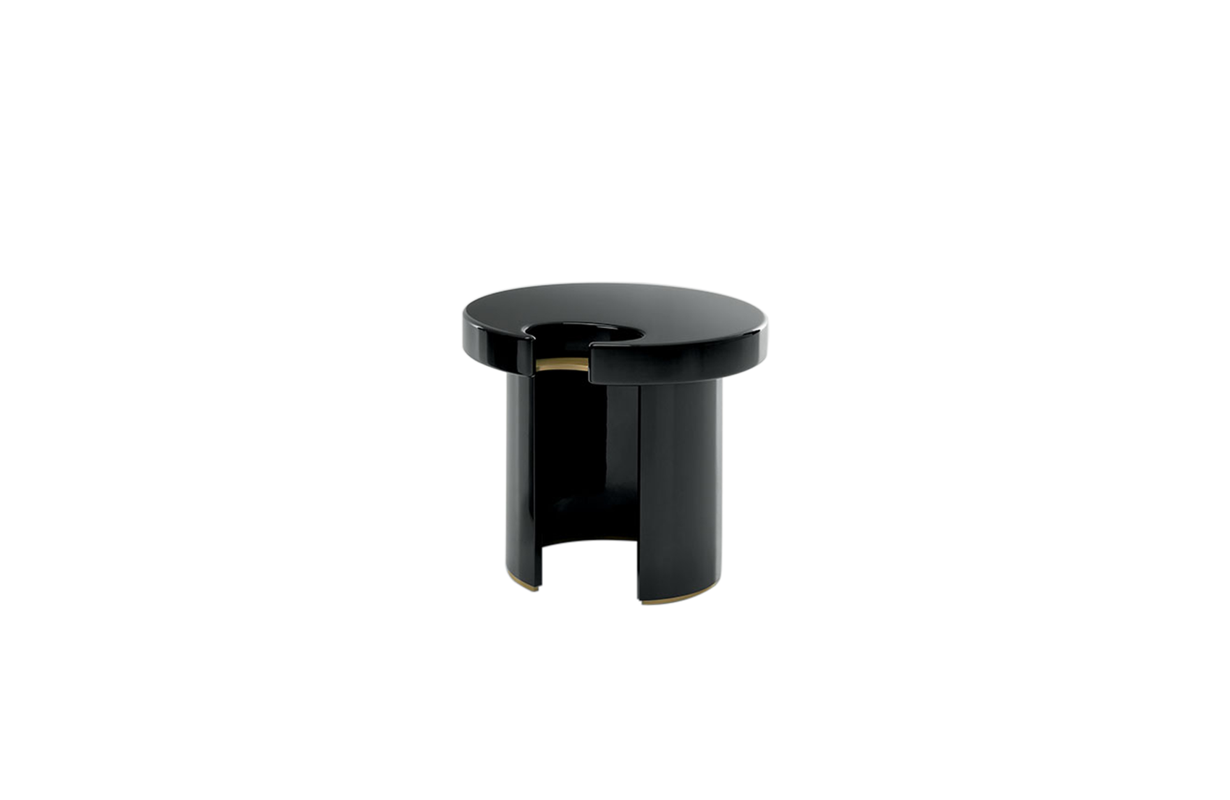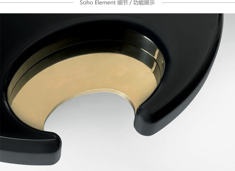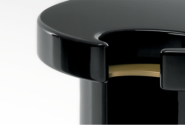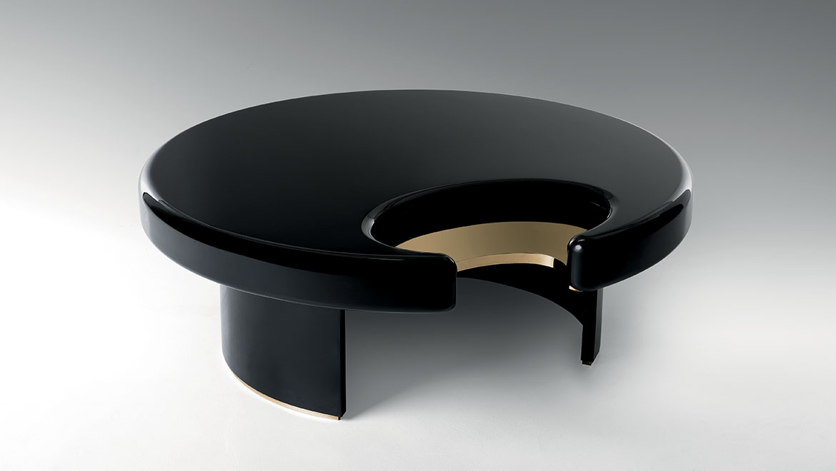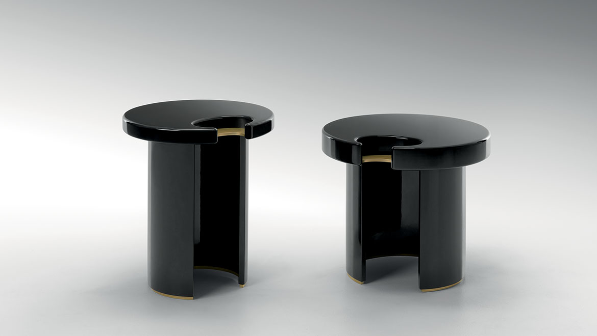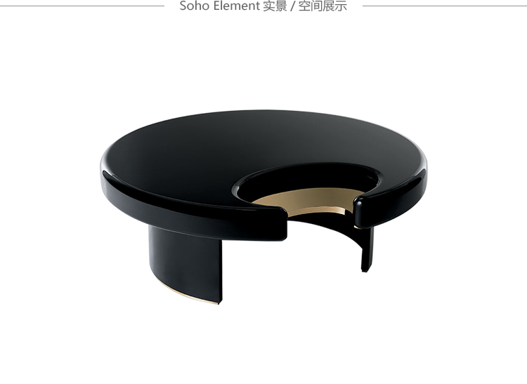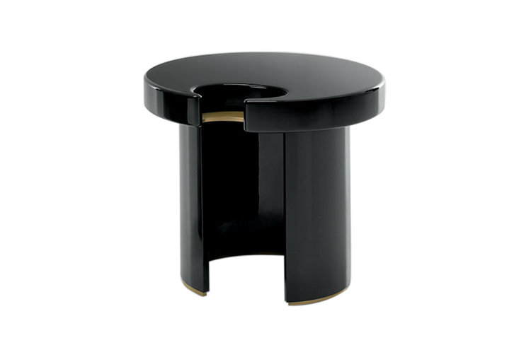 咖啡桌和边桌是一种富有美感的设计。顶部的圆形和圆柱状结构装饰有金属细节,与漆面形成对比。