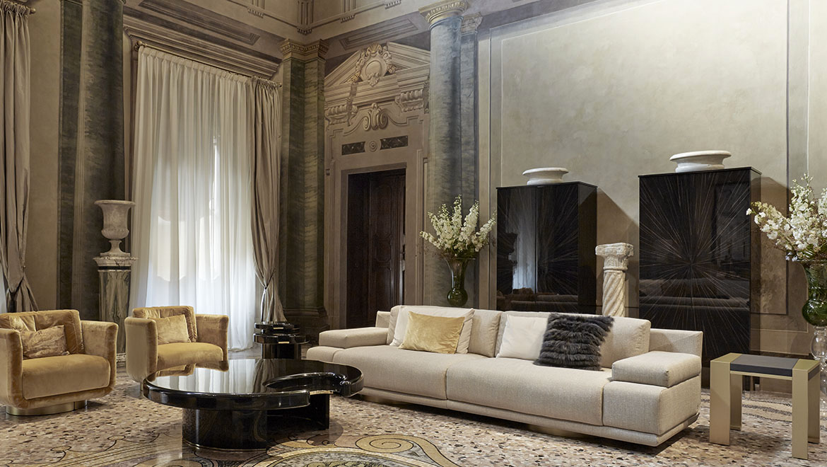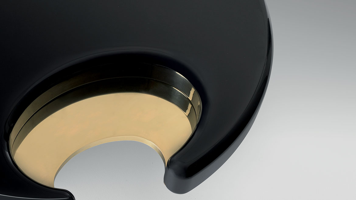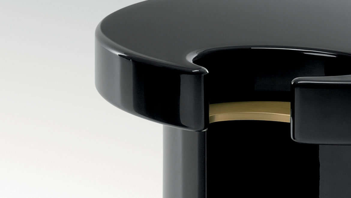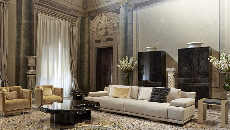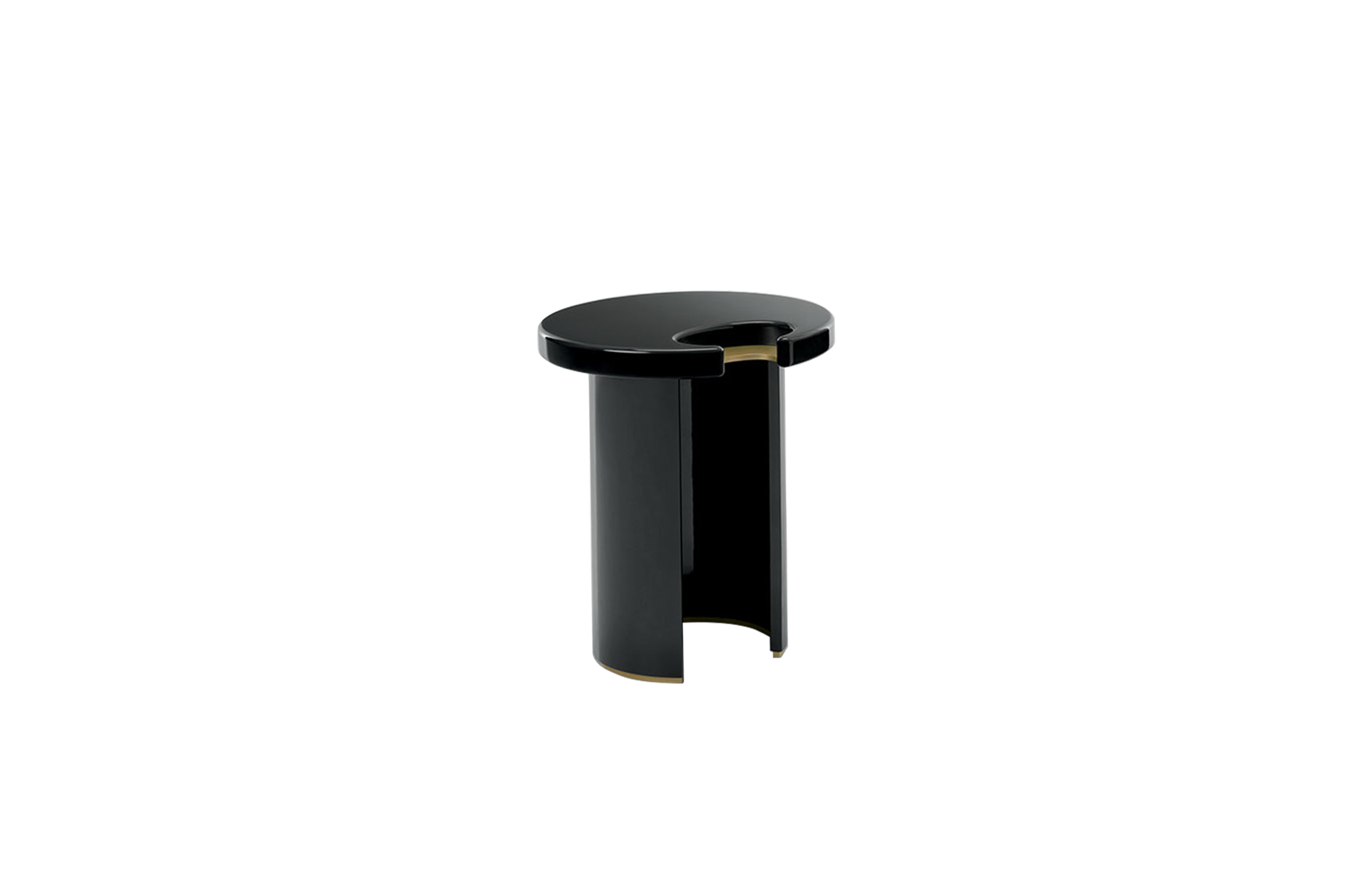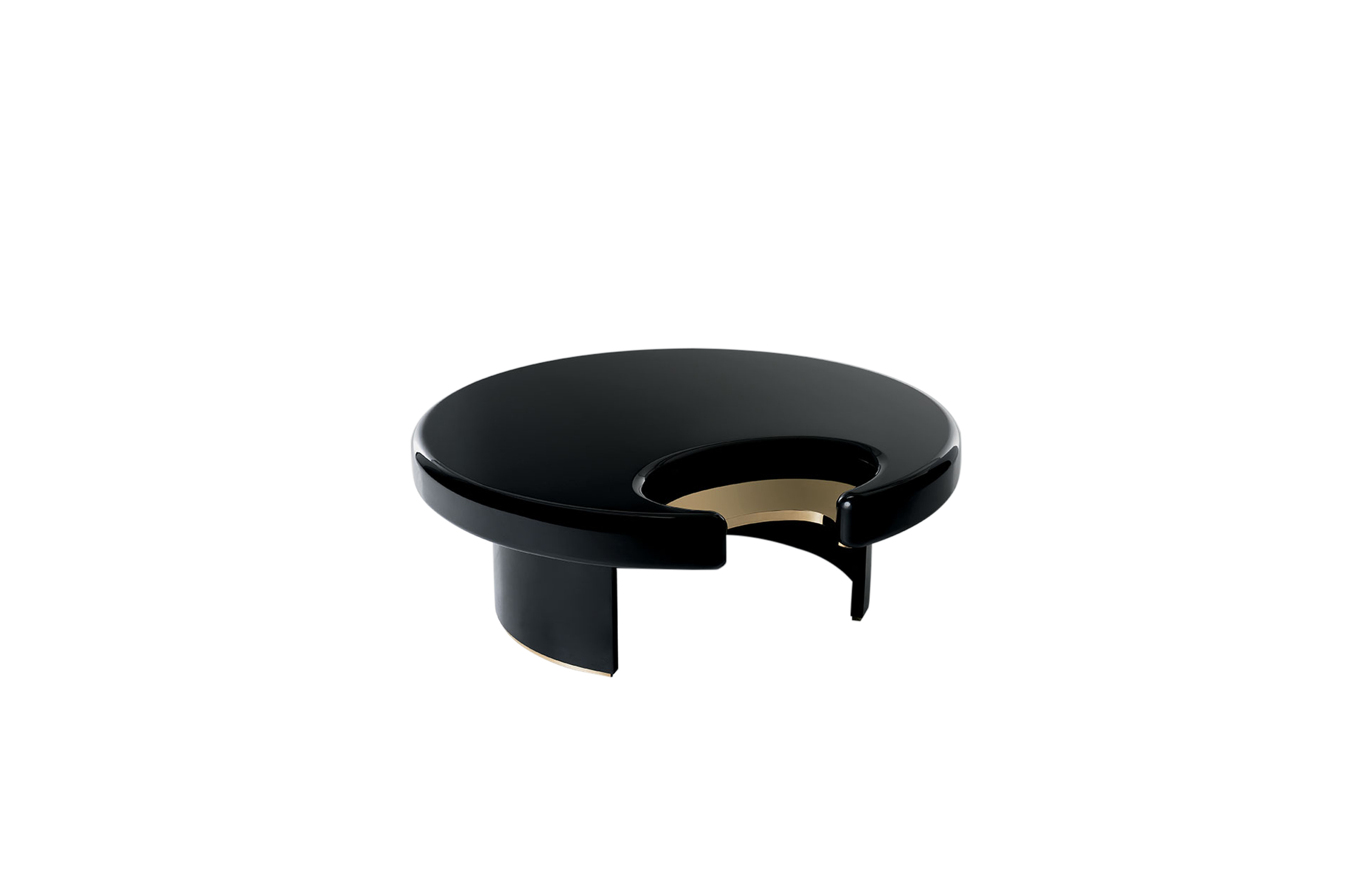 咖啡桌和边桌是一种富有美感的设计。顶部的圆形和圆柱状结构装饰有金属细节,与漆面形成对比。