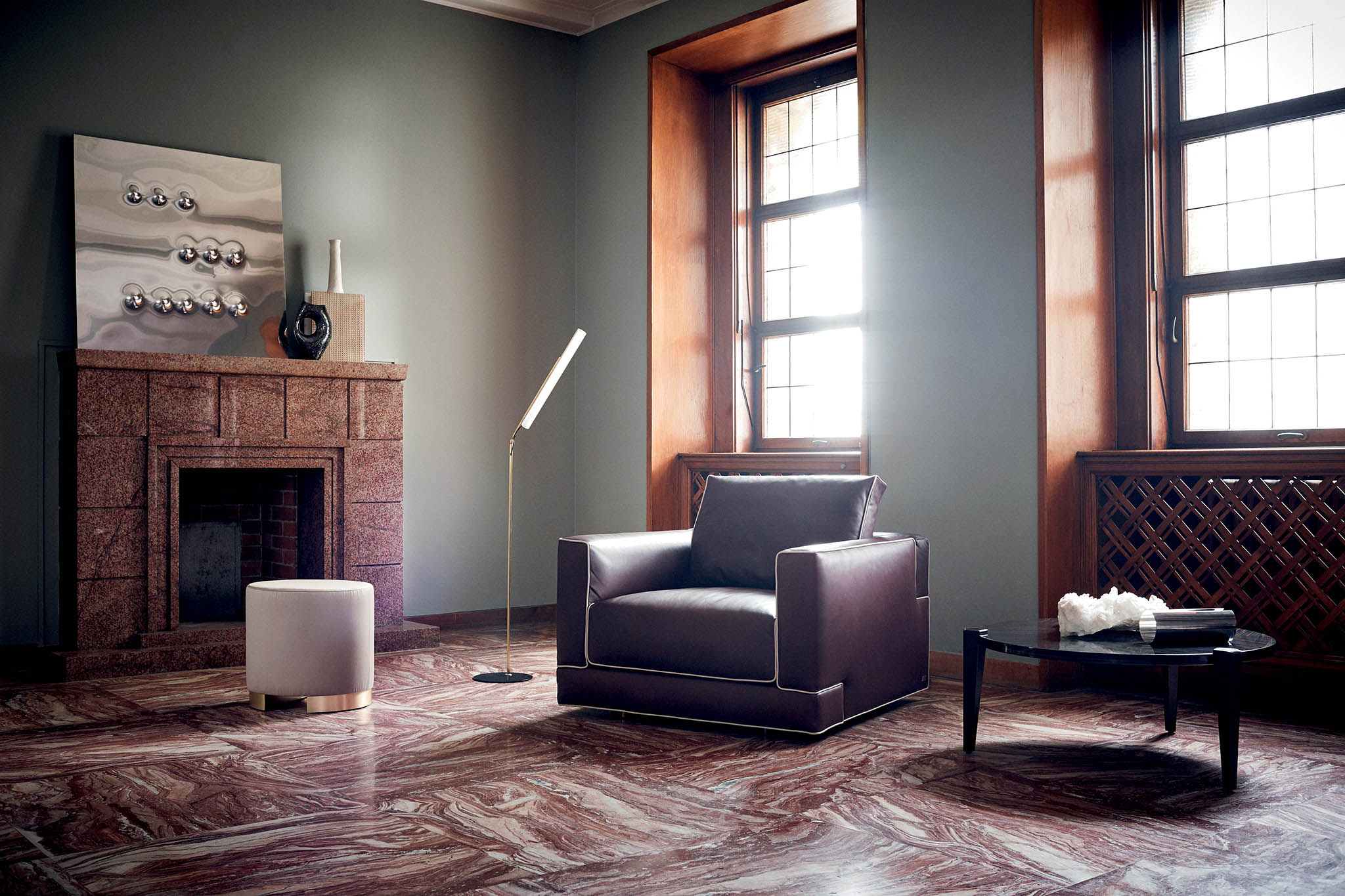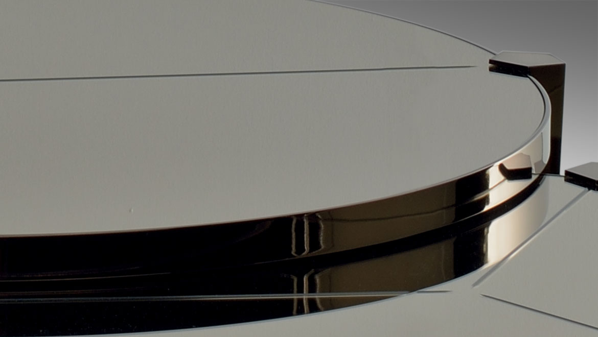 Matched to perimetral stainless steel frame with polished chrome, gun-metal