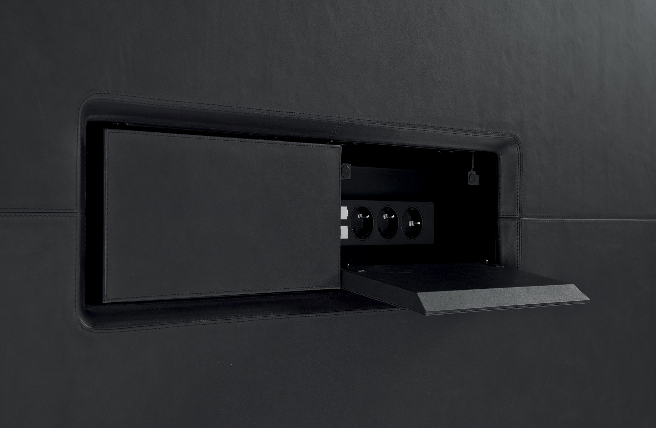 Ebony Macassar with diamond drawing matt finishing. Spacer-joint undertop in glossy brushed wood coordinated with the leather top, matt or polished