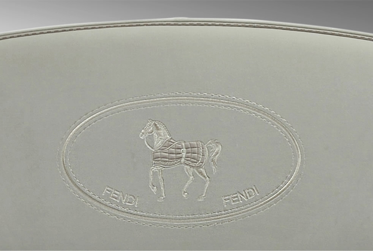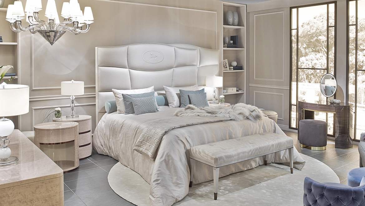 Sumptuous volumes and important dimensions for the new George bed caratherizied by its imposing headboard, finely handcrafted with motif made up of irregular squares arranged in a linear pattern. The soft upholstery is enhanced in the central part by the iconic Villa Borghese embroidery.