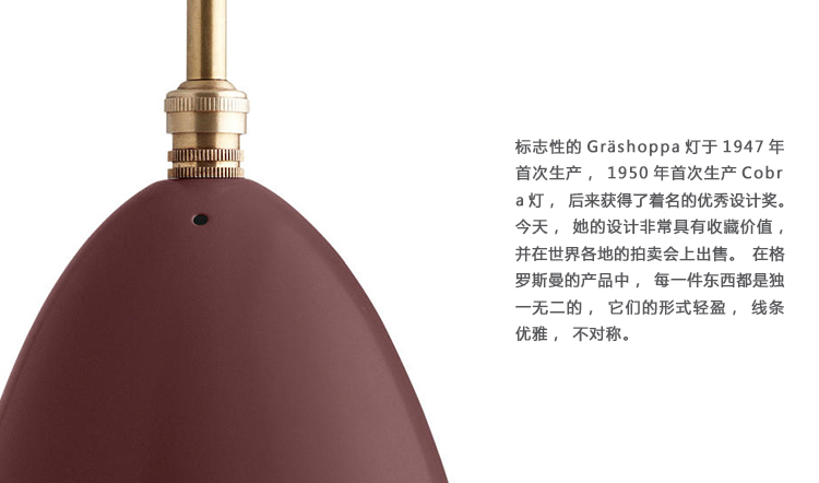 Greta M. Grossman(1906-1999)是瑞典设计师和建筑师。她在20世纪40年代移民到美国,在那里她在定义世纪中期加利福尼亚现代主义美学方面扮演了重要角色。标志性的草?shoppa灯第一次产生了在1947年和1947年的眼镜蛇灯,后来赢得了著名的优秀设计奖项。如今,她的设计非常有收藏价值,并在世界各地的拍卖会上出售。在格罗斯曼的产品中,每一件东西都是独一无二的,它们的形式轻盈,线条优雅,不对称。