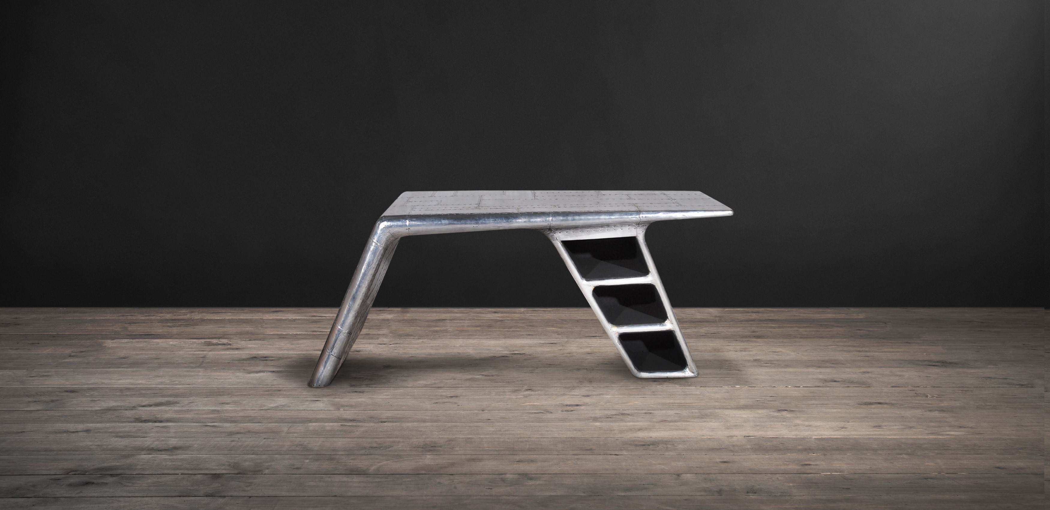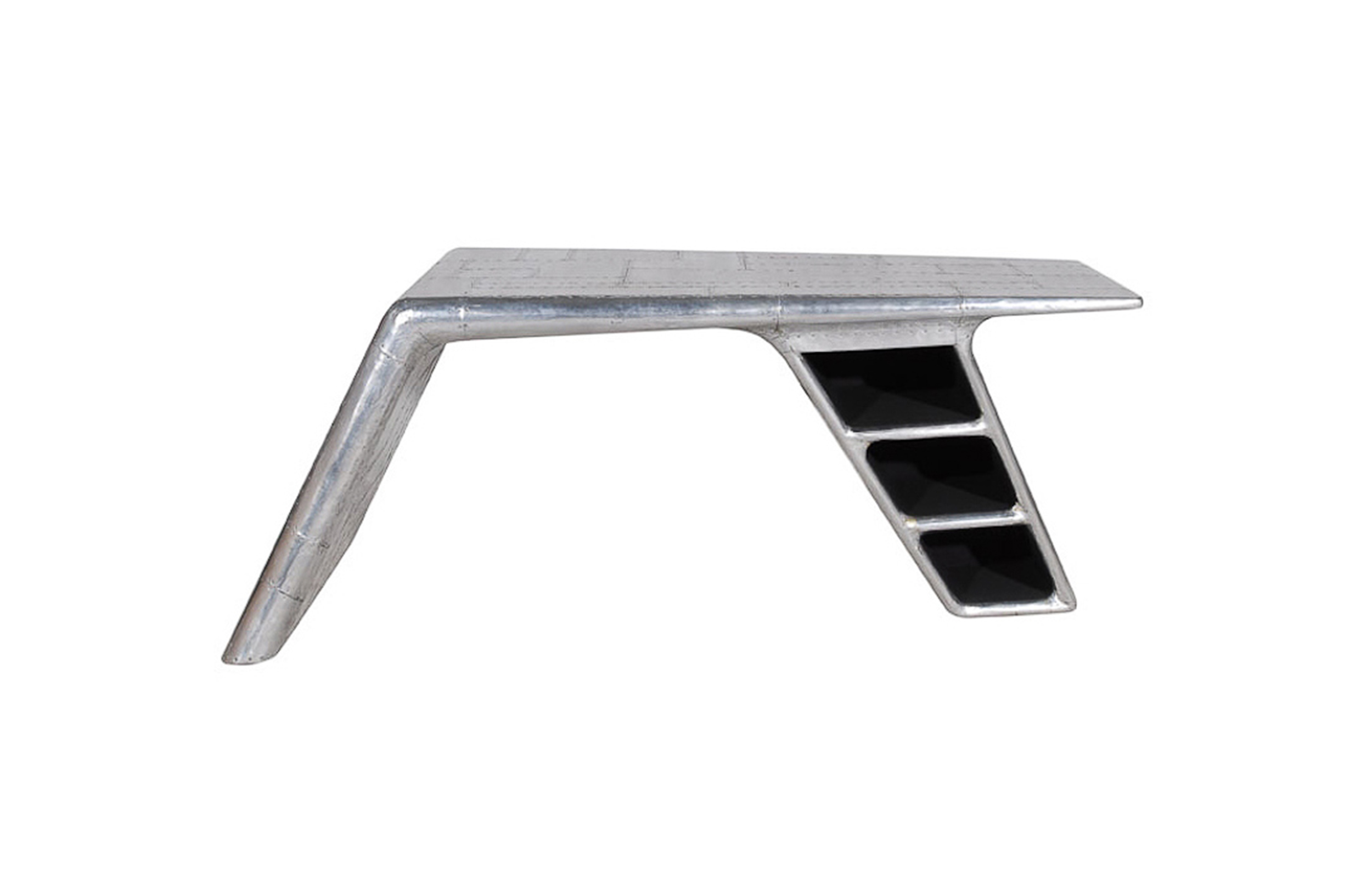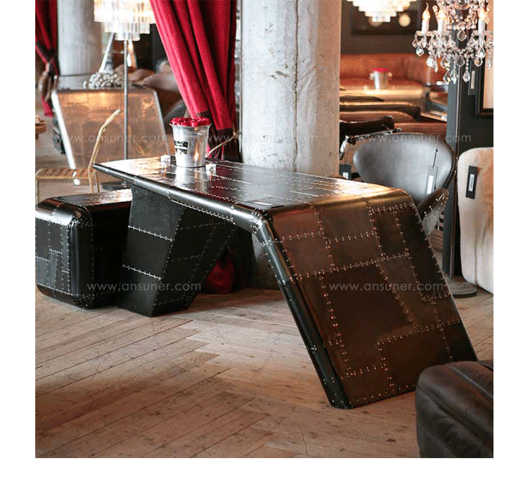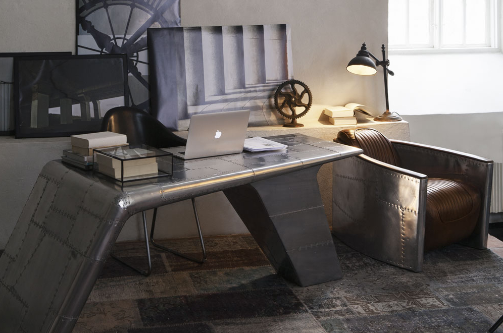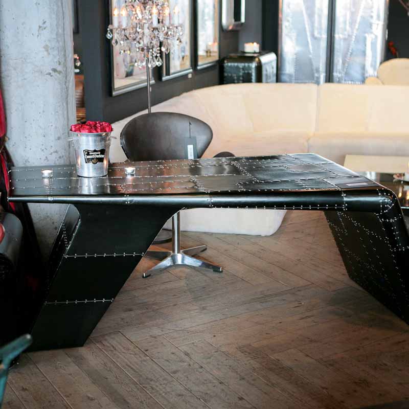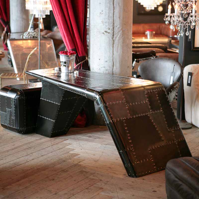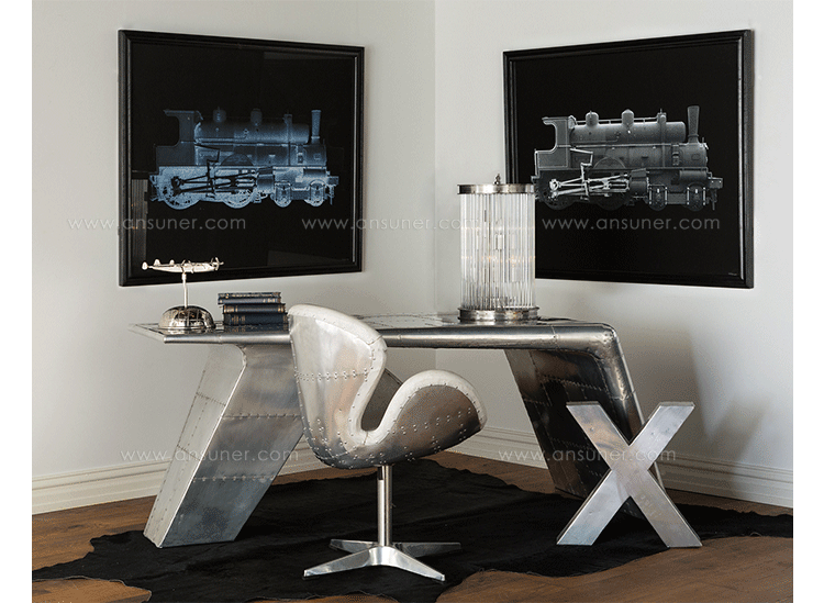 Aviator Valkyrie Desk(飞行员瓦尔基里台)由英国著名设计师Timothy Oulton设计,灵感来源于1960年北美航空的超音速轰砸飞机XB70,并以此命名。瓦尔基里台用铆接铝板制造,弧形线条符合空气动力学,有如一双机翼,通过手工艺进行打磨,进行磨光,座子整体造型有如喷火战机或黑色喷火式战斗机。