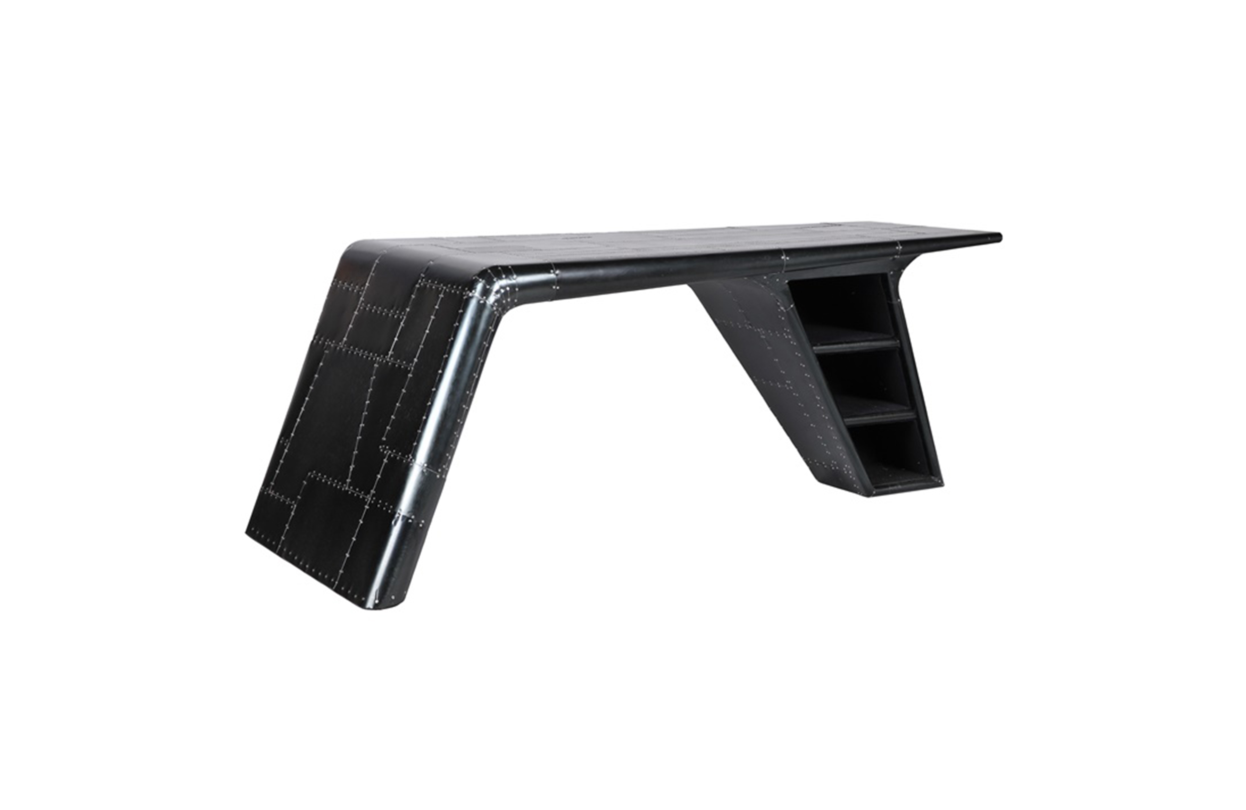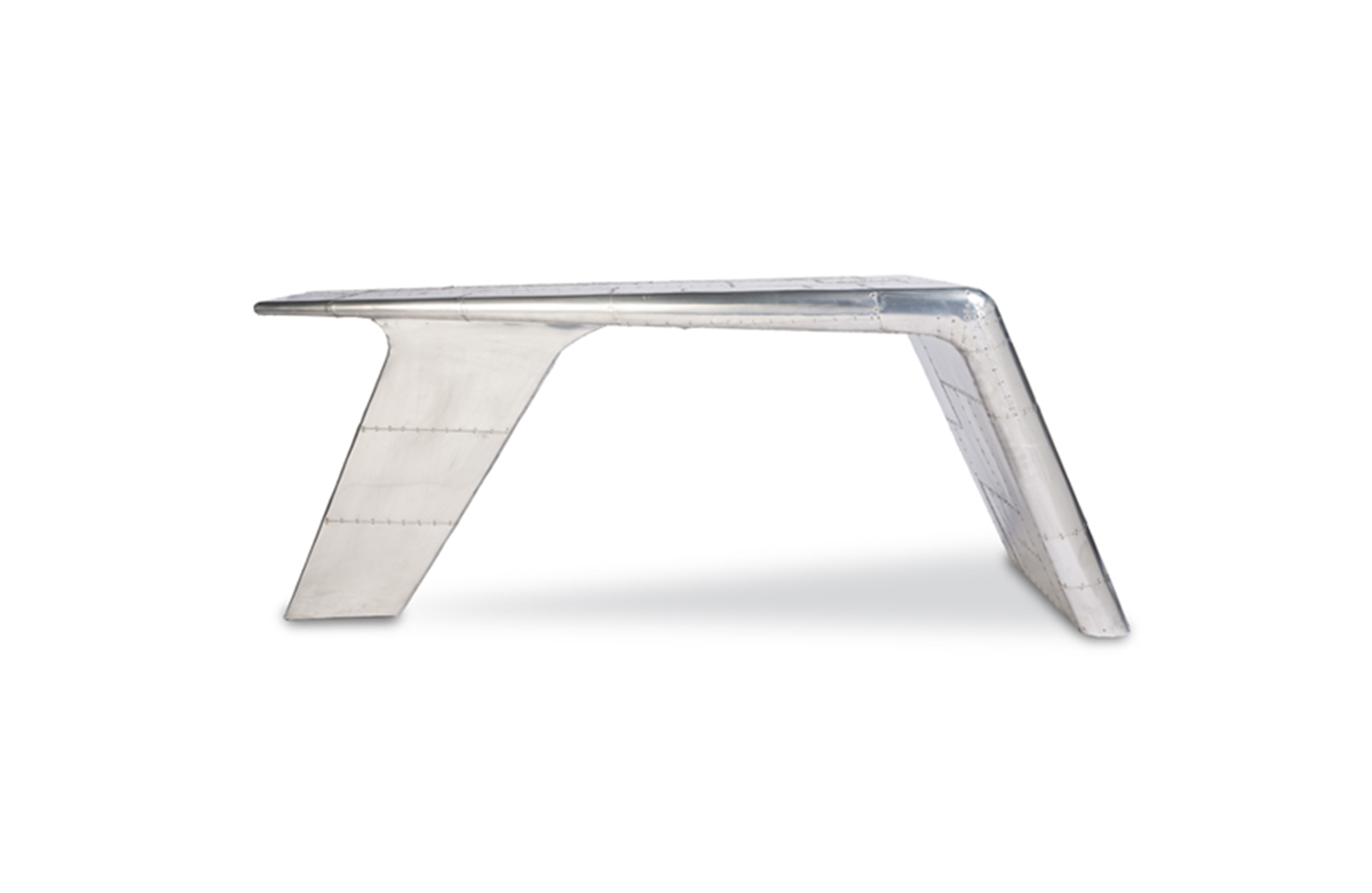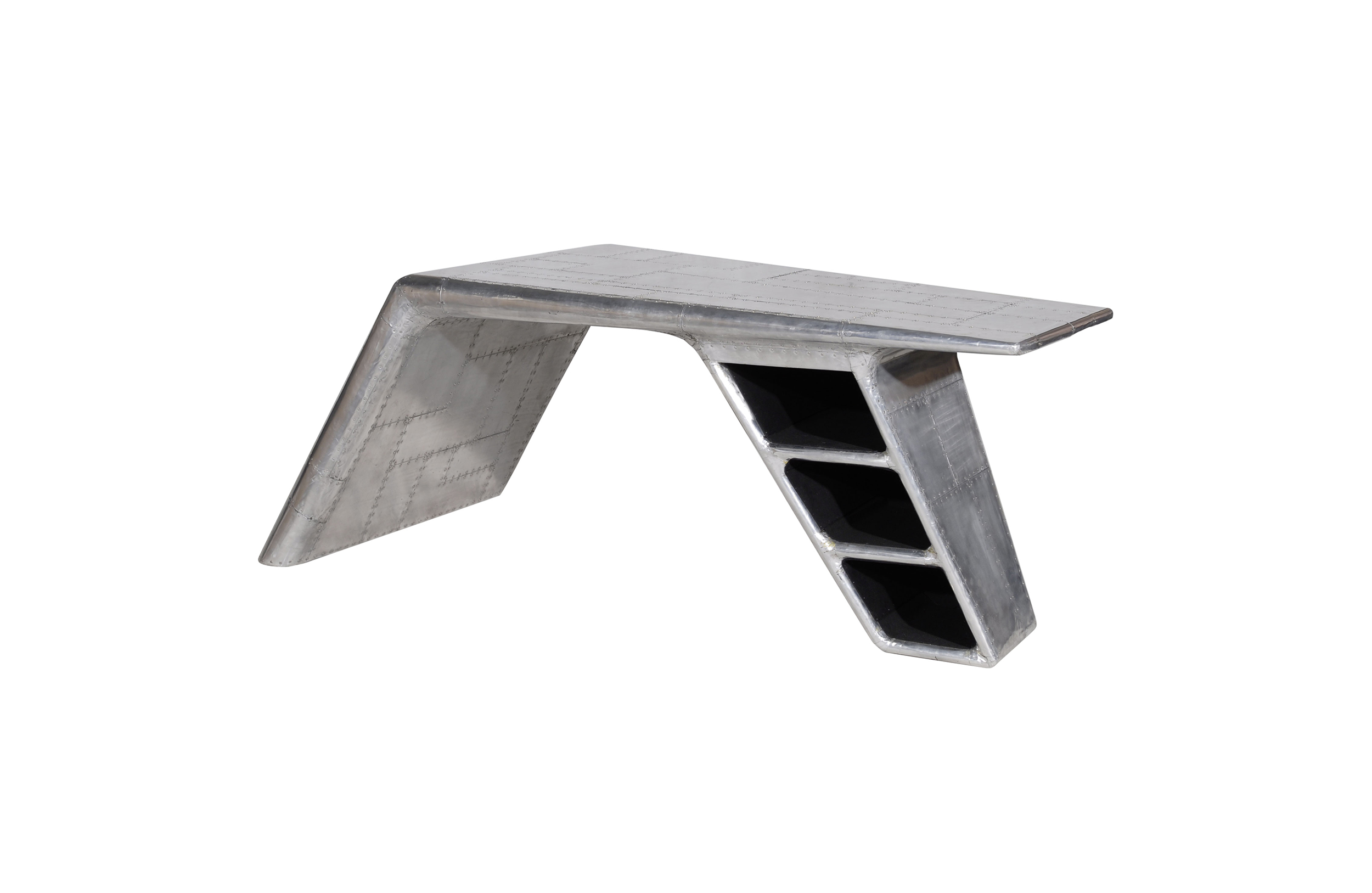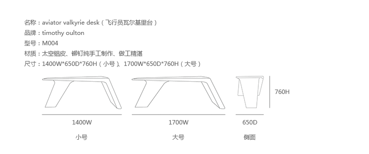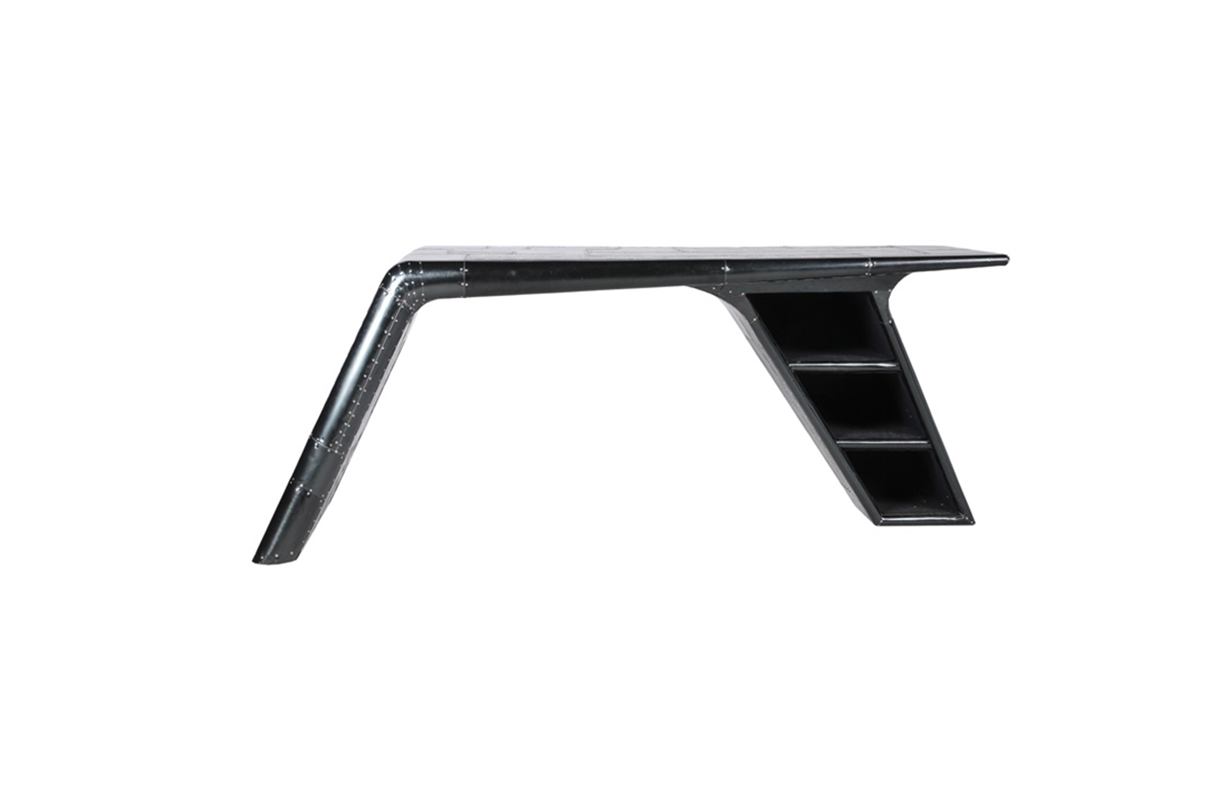 Aviator Valkyrie Desk(飞行员瓦尔基里台)由英国著名设计师Timothy Oulton设计,灵感来源于1960年北美航空的超音速轰砸飞机XB70,并以此命名。瓦尔基里台用铆接铝板制造,弧形线条符合空气动力学,有如一双机翼,通过手工艺进行打磨,进行磨光,座子整体造型有如喷火战机或黑色喷火式战斗机。