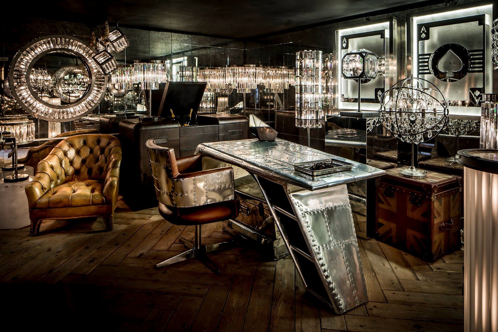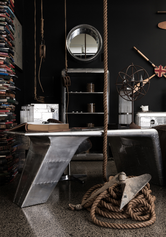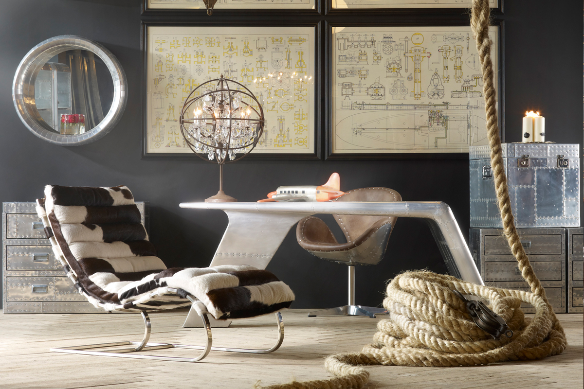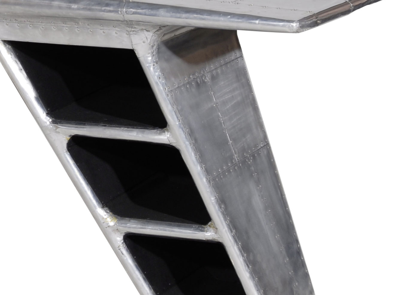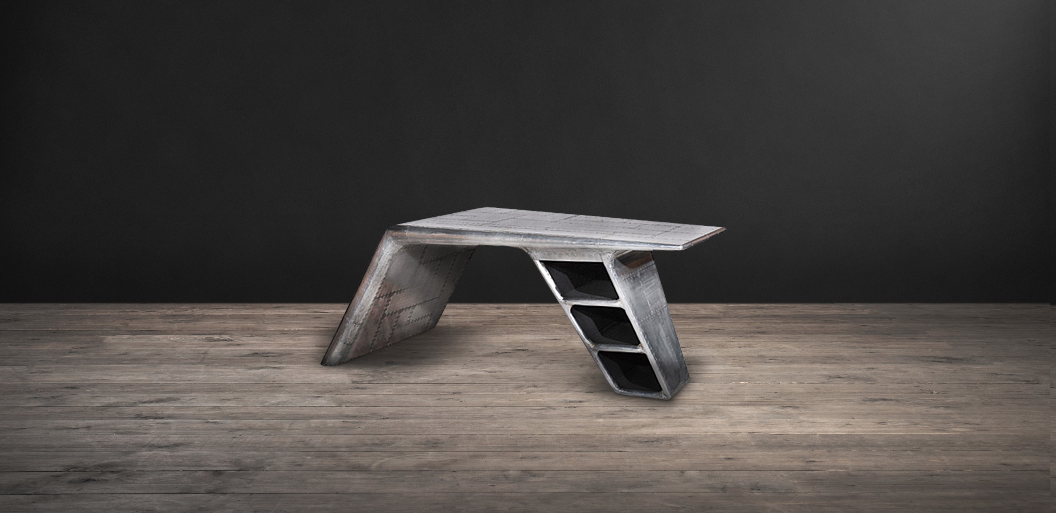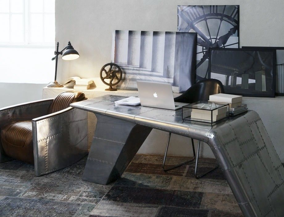 Aviator Valkyrie Desk(飞行员瓦尔基里台)由英国著名设计师Timothy Oulton设计,灵感来源于1960年北美航空的超音速轰砸飞机XB70,并以此命名。瓦尔基里台用铆接铝板制造,弧形线条符合空气动力学,有如一双机翼,通过手工艺进行打磨,进行磨光,座子整体造型有如喷火战机或黑色喷火式战斗机。