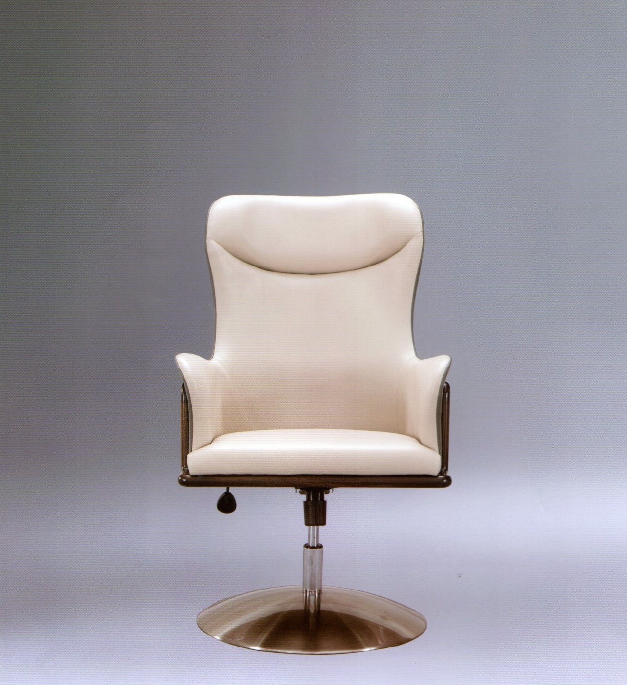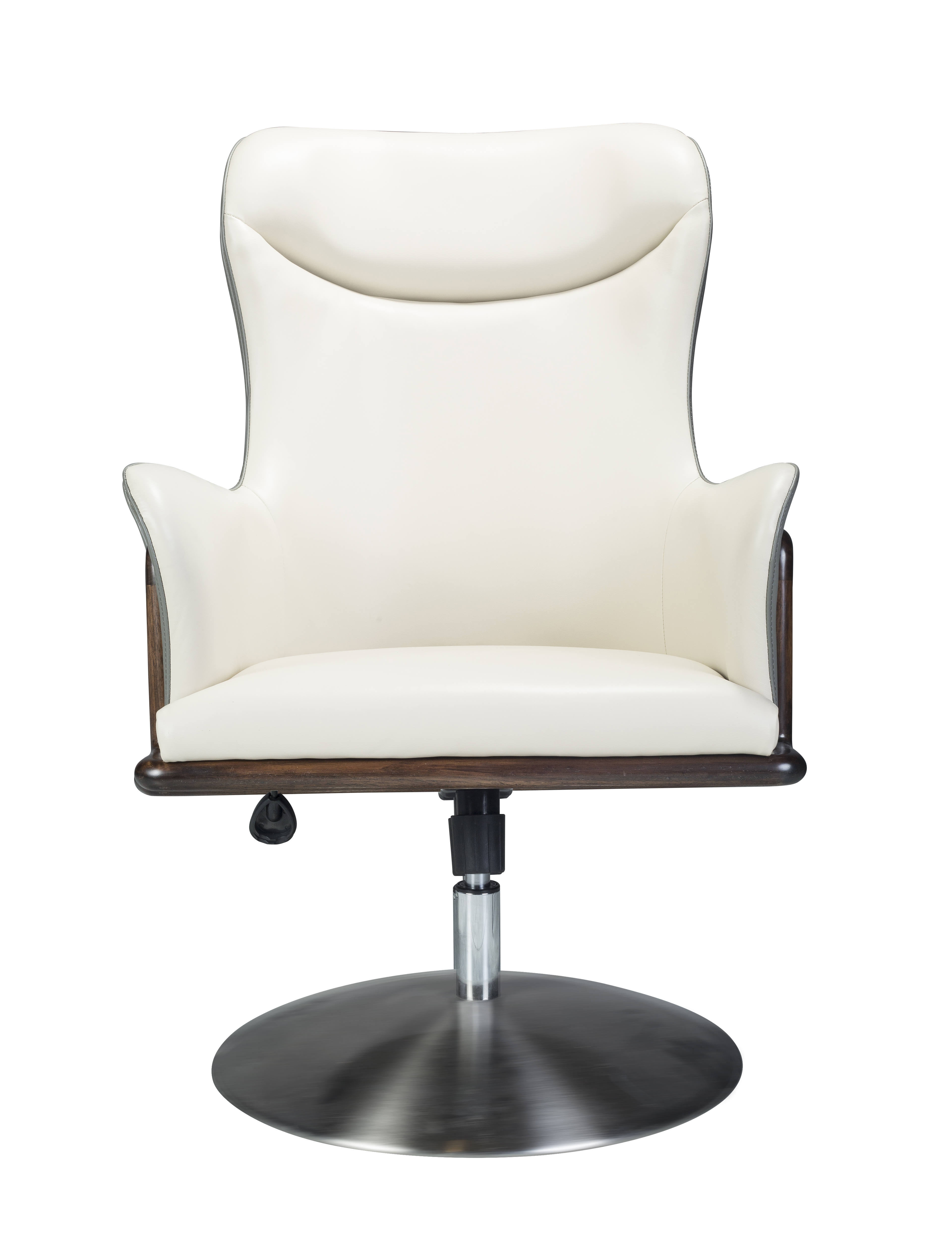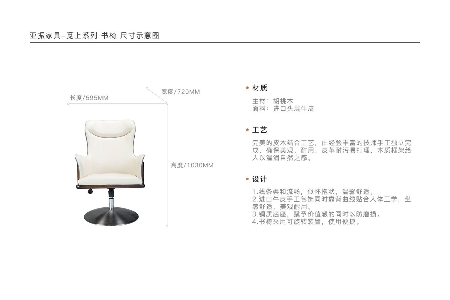 1.线条柔和流畅,似怀抱状,温馨舒适。 2.进口牛皮手工包饰同时靠背曲线贴合人体工学,坐感舒适,美观耐用。 3.铜质底座,赋予价值感的同时以防磨损。 4.书椅采用可旋转装置,使用便捷。