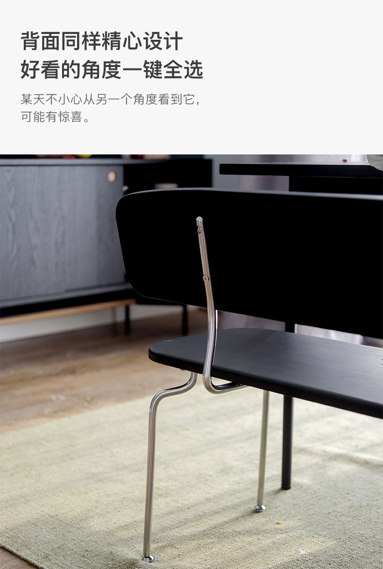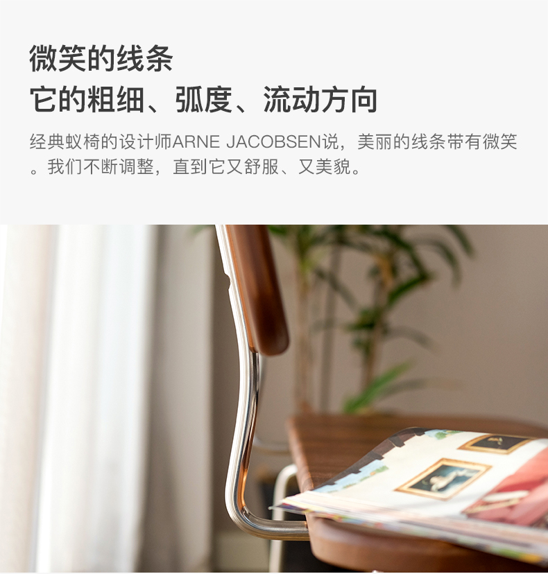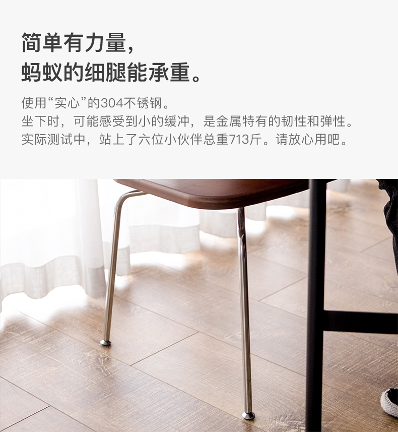 经典蚂蚁椅的设计师ARNE JACOBSEN说,美丽的线条带有微笑。我们不断调整, 直到它又舒服、又美貌。不锈钢的线条创造出神奇的光影,让眼睛随着线条流动, 宛转自然,也有视觉支点。背面同样精心设计,好看的角度一键全选。 使用实心的304不锈钢,坐下时,可能感受到小的缓冲,是金属特有的韧性和弹性。