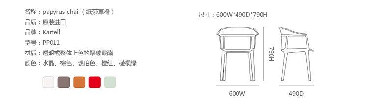 Papyrus Chair(纸莎草椅)是由Ronan & Erwan Bouroullec法国兄弟设计组合于今年为Kartell公司设计,并且在本次的米兰家具展中进行了展出。该设计的灵感来自于一把结构鲜明的古老座椅Linear,座椅本身非常舒适且重量很轻。其共有透明、黄、绿、紫、烟灰、棕、蓝和红八种颜色。这把椅子结合半透明的脚架,脚架“打磨”纤细的卵石状颗粒,并延伸至整个靠背的外轮廓,线条柔软和舒适。和整个结构都是透光的。因惊喜的做工和颜色的运用,使其非常吸引人。