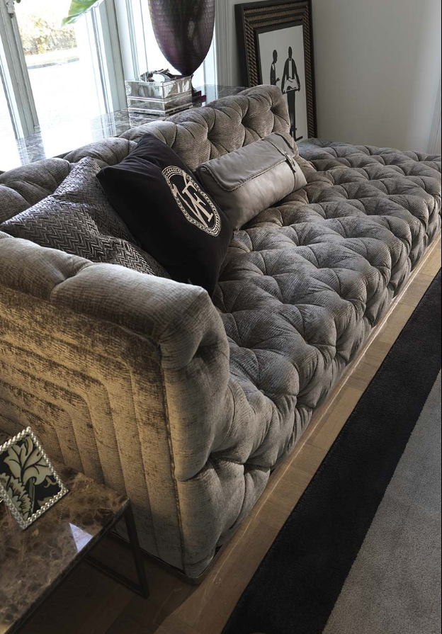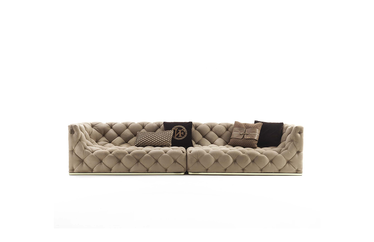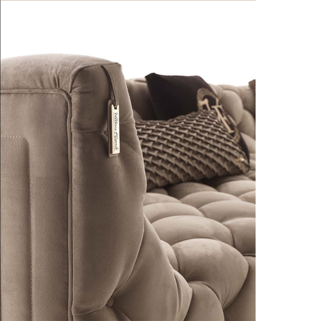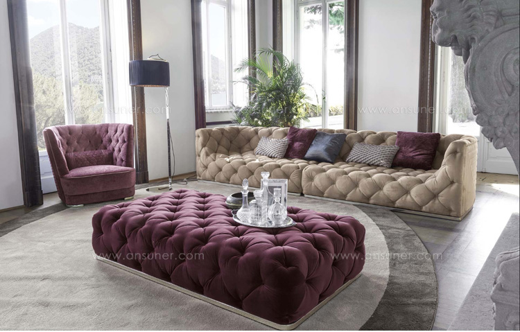 沙发表面覆盖皮革,基底颜色是黄金色,按扣在同一材料的封面.