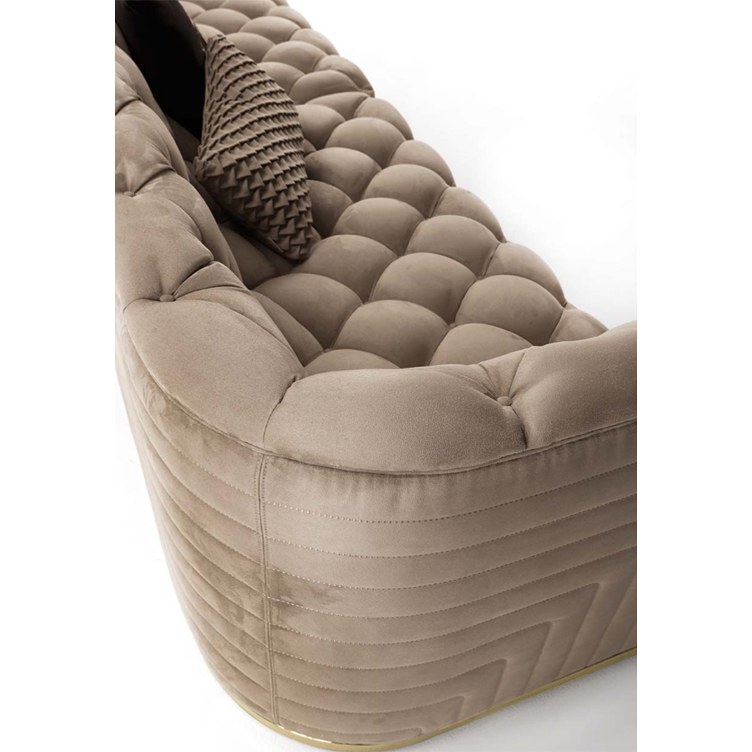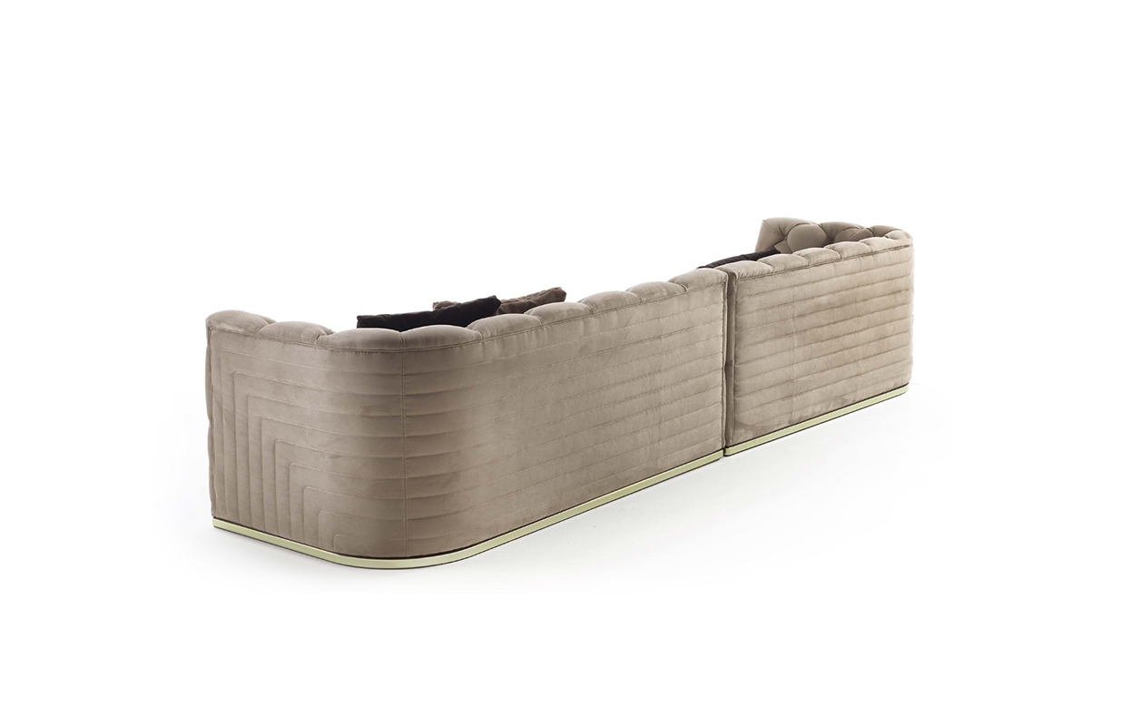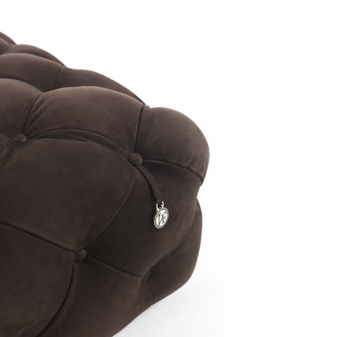 沙发表面覆盖皮革,基底颜色是黄金色,按扣在同一材料的封面.