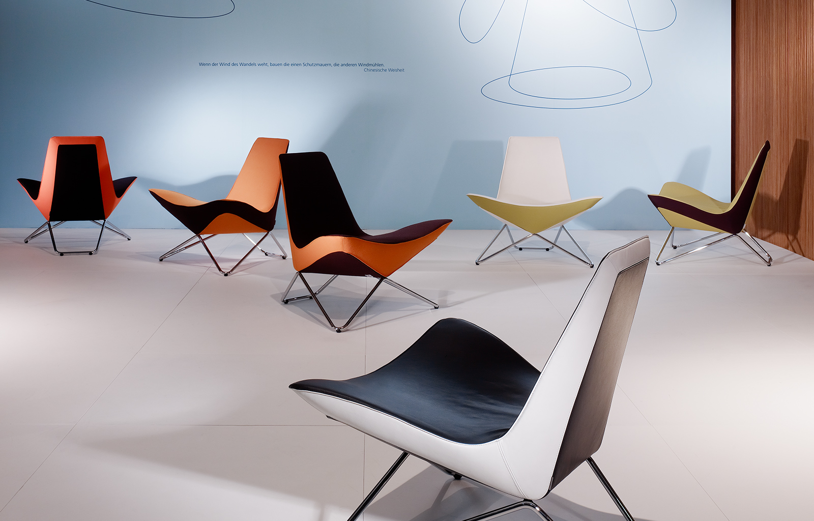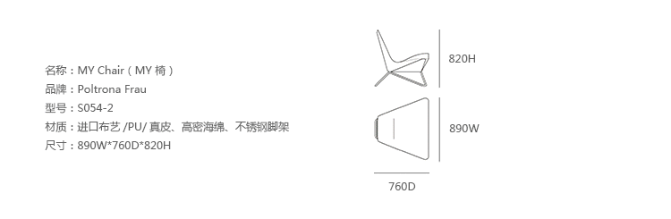 MY Chair(MY 椅)是由荷兰建筑师Ben van Berkel于2008年设计的,并且在2008科隆Orgatec展中进行了展出。该座椅是利用单一与多样设计而成,倾斜、围绕及笔直部位的相互连接,强烈颜色差异给予座椅的动感,使得其从任何角度观看都能给人以深刻印象。Mychair椅座身采用海绵进行填充,表面包覆4款纺织或皮革面料,其底座则采用铬钢制成。