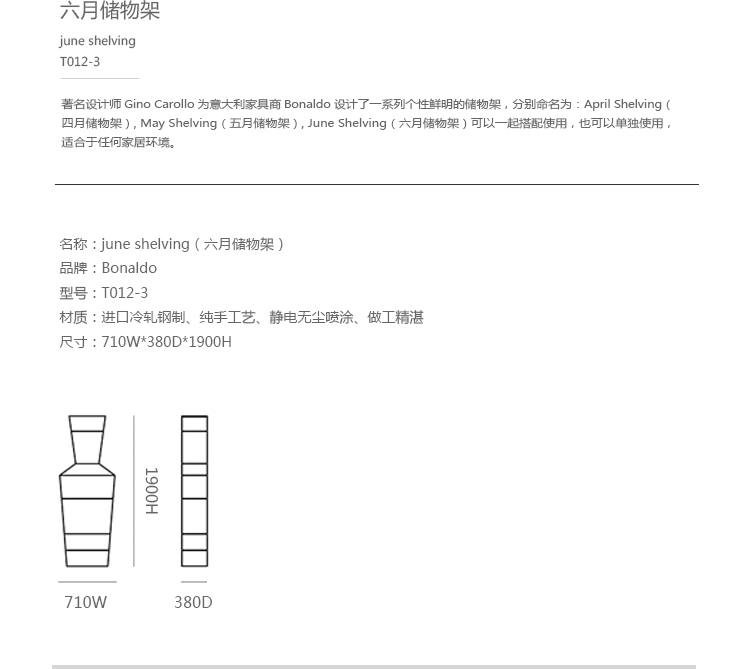 著名设计师Gino Carollo为意大利家具商Bonaldo设计了一系列个性鲜明的储物架,分别命名为:April Shelving(四月储物架)、May Shelving(五月储物架)、June Shelving(六月储物架)。它们不仅仅只是一个书架,同时更能代表使用者的形象和性格。April Shelving(四月储物架)、May Shelving(五月储物架)、June Shelving(六月储物架)可以一起搭配使用,也可以单独使用,适合于任何家居环境。框架和货架都是由哑光的精髓职称,有黑色、 白色、 藏红花的黄色、 红色、 蓝色、 绿色、 薄荷绿、 无烟煤灰色、 鸽灰色、 棕色和粉红色可以供您选择。