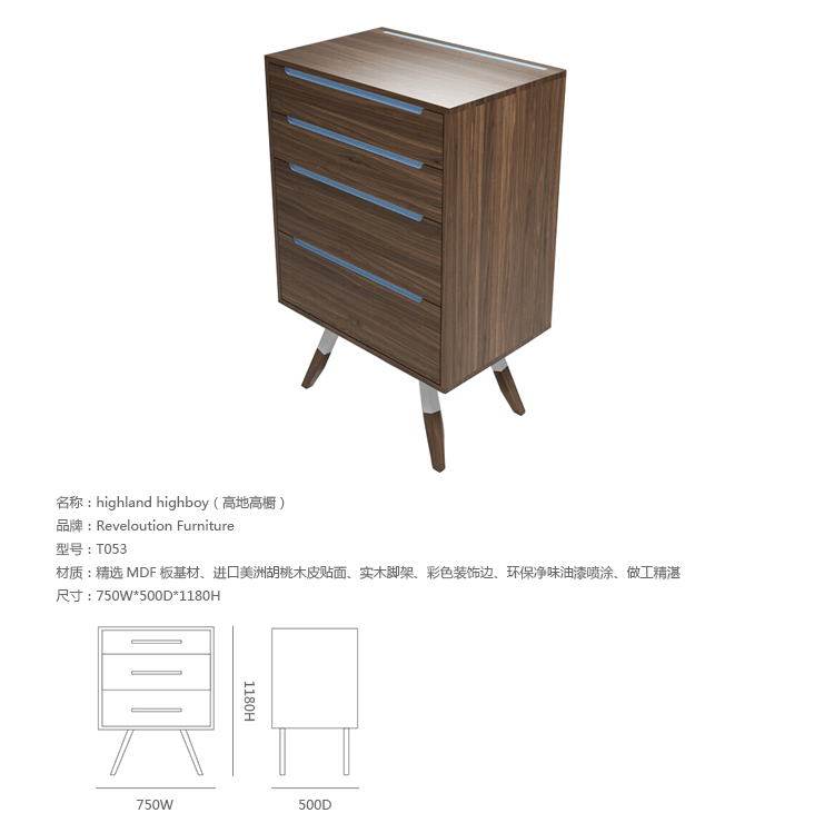 "highland highboy(高地高橱)可以根据您的需求和风格,以适应任何卧室去定做。有时最简单的事物有最大的细节,highland highboy(高地高橱)绝对是理想的选择。制作采用精选MDF板基材、进口美洲胡桃木皮贴面、实木脚架、彩色装饰边、环保净味油漆喷涂、做工精湛。"