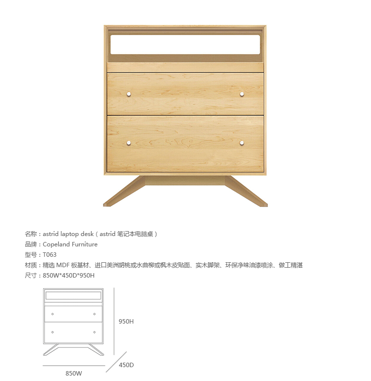 astrid laptop desk(阿斯特丽德笔记本电脑桌)宽大的八字形脚架非常吸引人注目,制作astrid laptop desk并非易事,它其实是一个大工程,同时能引发无限期望和激情。astrid laptop desk的特点精密轴承,充分扩展滑行,包括拔出键盘托盘、中间储物抽屉和较低的文件抽屉。制作采用精选MDF板基材、进口美洲胡桃或水曲柳或枫木皮贴面、实木脚架、环保净味油漆喷涂、做工精湛。