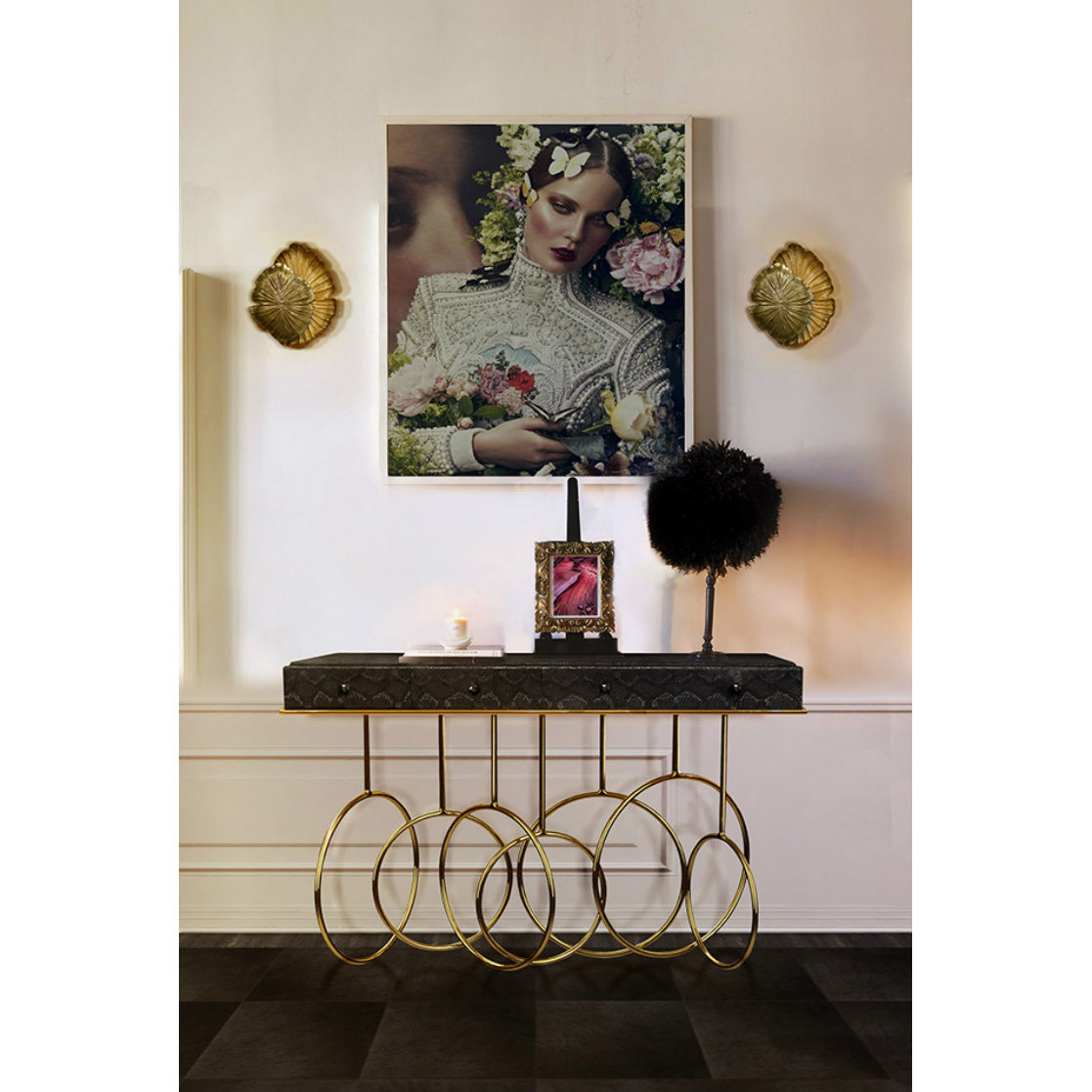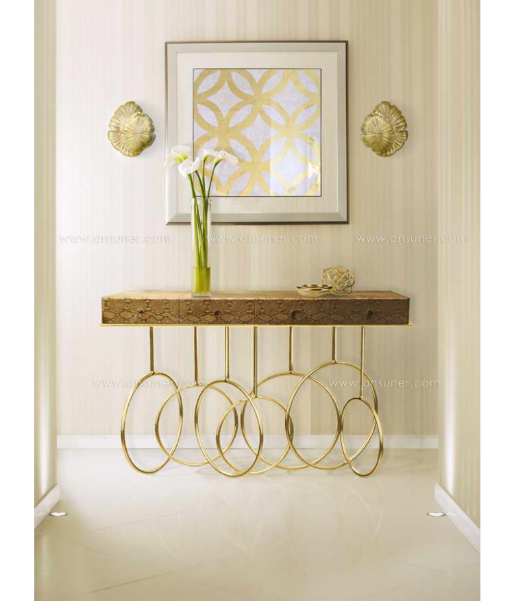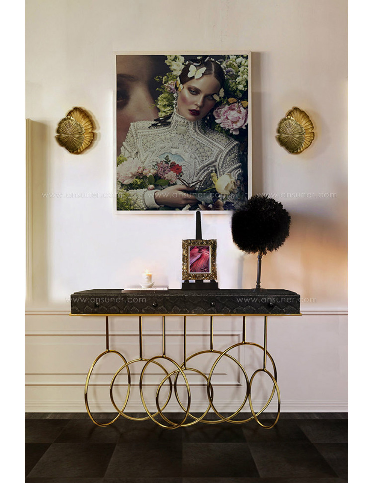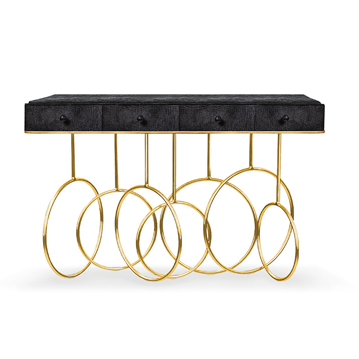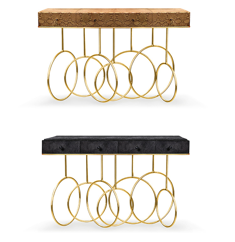 Burlesque console的设计灵感源于通过重新审视法国歌舞表演令人眼花缭乱的世界。在这四个抽屉里的每一个抽屉都是由一个散发异国风情的蛇皮扪面和黑色的水晶状拉手组成,底架由仿佛旋转着的金色环状不锈钢构成脚架,散发出一股活跃的女主角的神秘特质。
