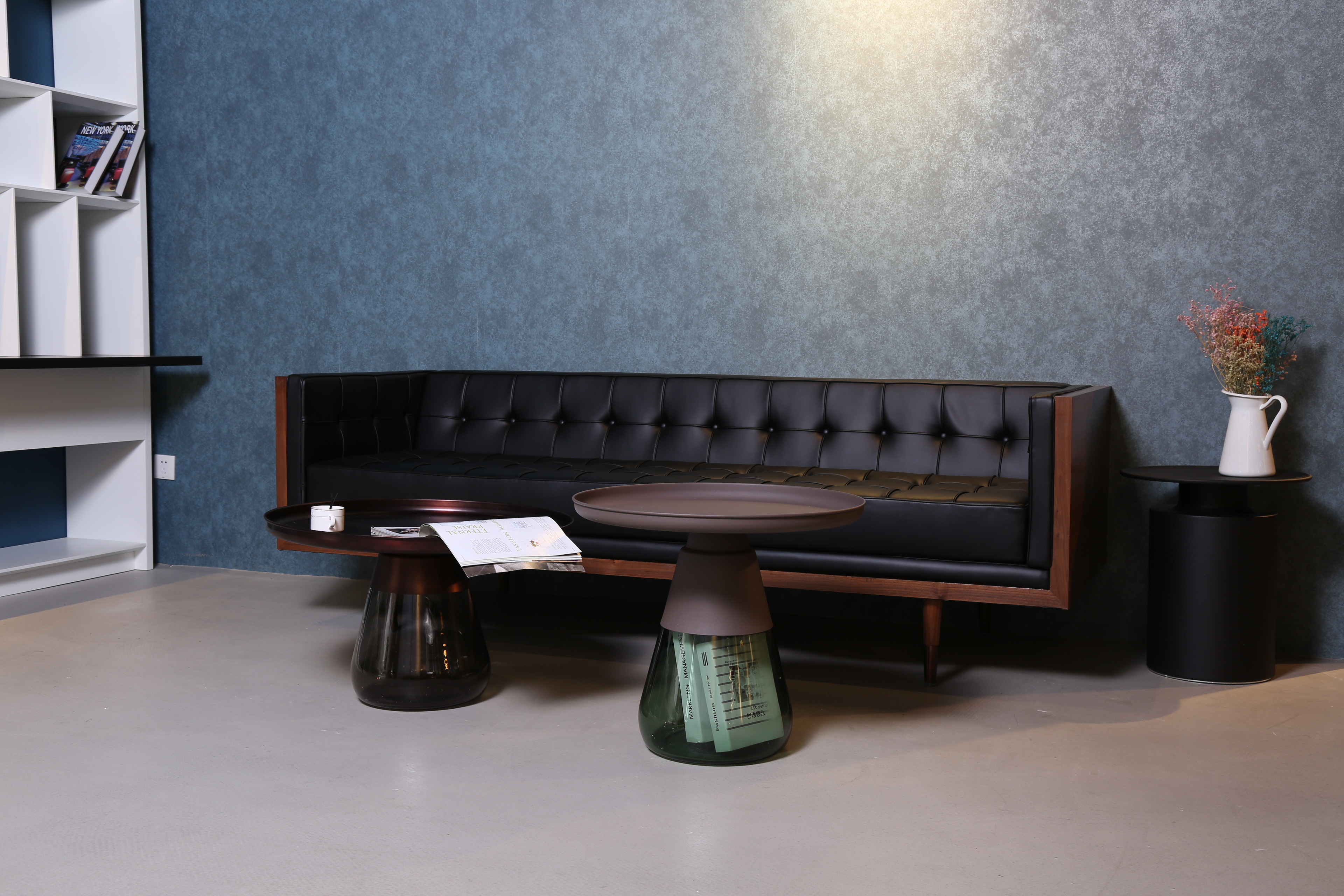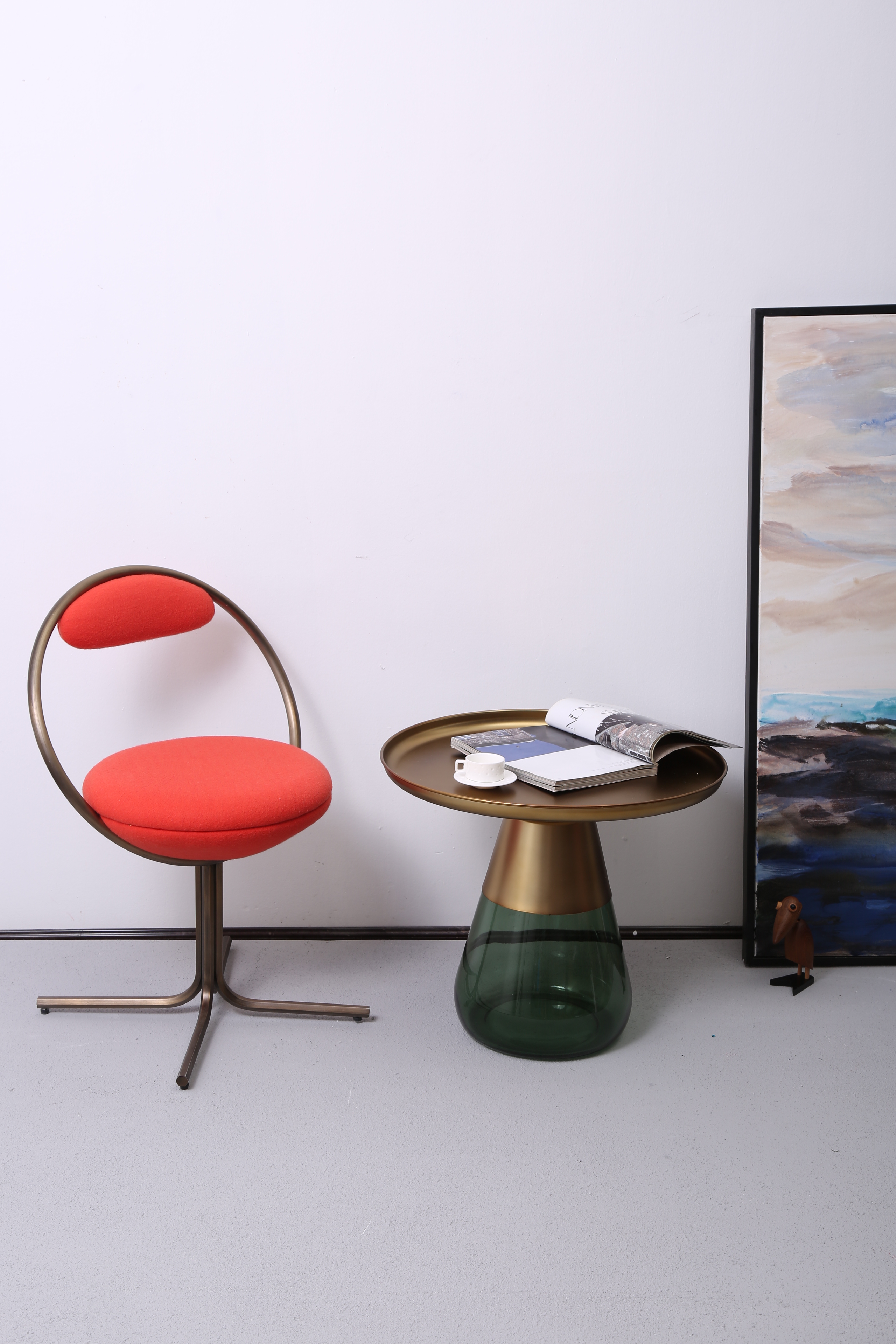 这款半透明带有色彩的玻璃和铝合金组成的手捧咖啡几,有着穿越历史长河的影子,竟像是宫廷画中拿出来的一般,底座的玻璃带给人温润如玉的视觉和触觉的通感。