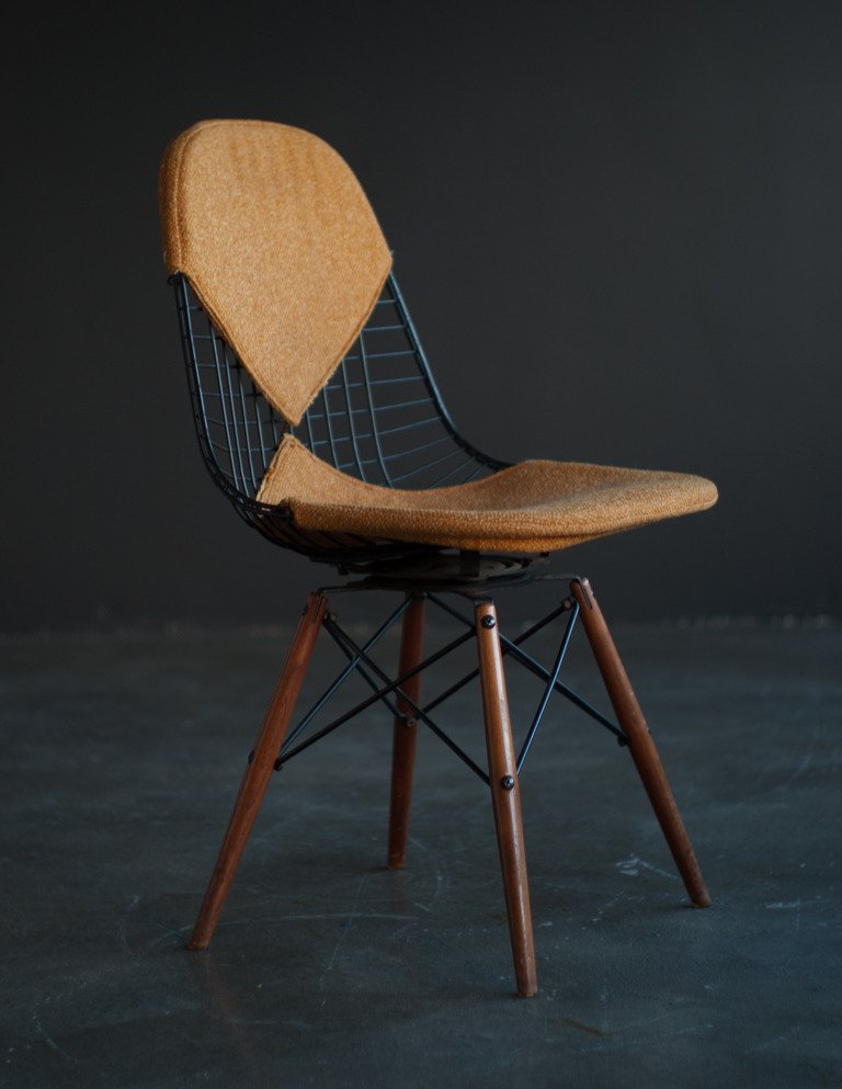 Charles & Ray Eames 1951 年發表的 Wire Chair 系列,以一片式有機網狀椅座,延伸變化出一系列不同椅腳及座墊搭配的單椅,這系列椅款輕巧透明的設計,在 60 年代可說是運用了當時最先進的技術來製作,靈感則是來自於鏤空的金屬收納籃,金屬條交織的椅座,彎曲的弧面不僅符合人體工學,在視覺上更具有穿透性。