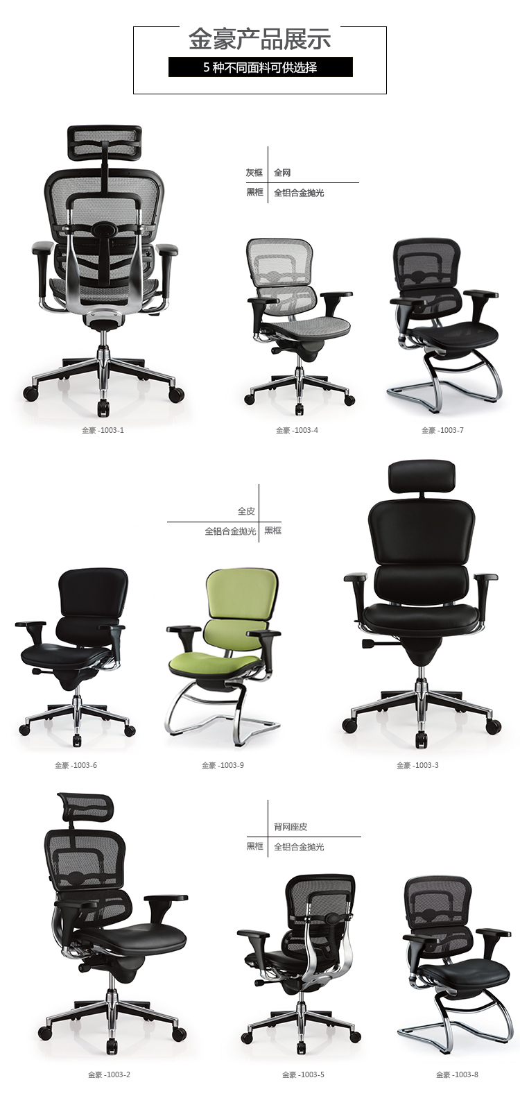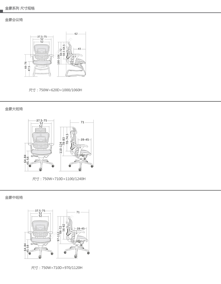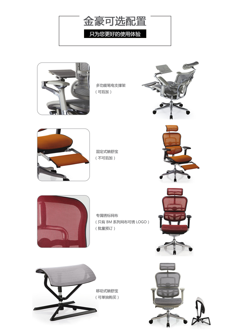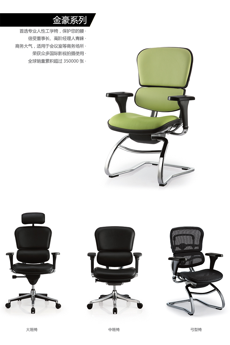 金豪系列采用完全性多功能调整设计,从椅背、扶手可进行全方位的调整;