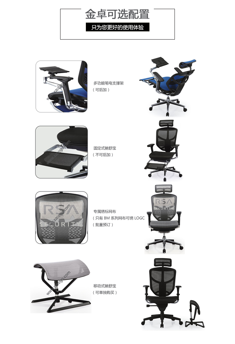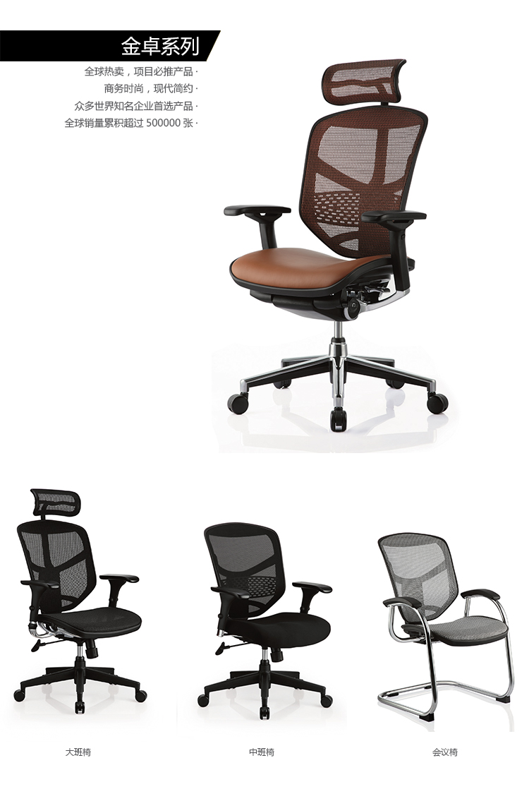 金卓系列采用完全性多功能调整设计,从头枕、椅背与座垫可进行全方位的调整;