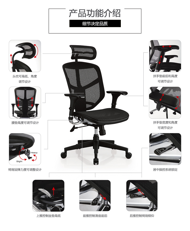 全球首创的单杆式操控底盘,一根杆操控所有功能,使办公椅的操控更加人性化;