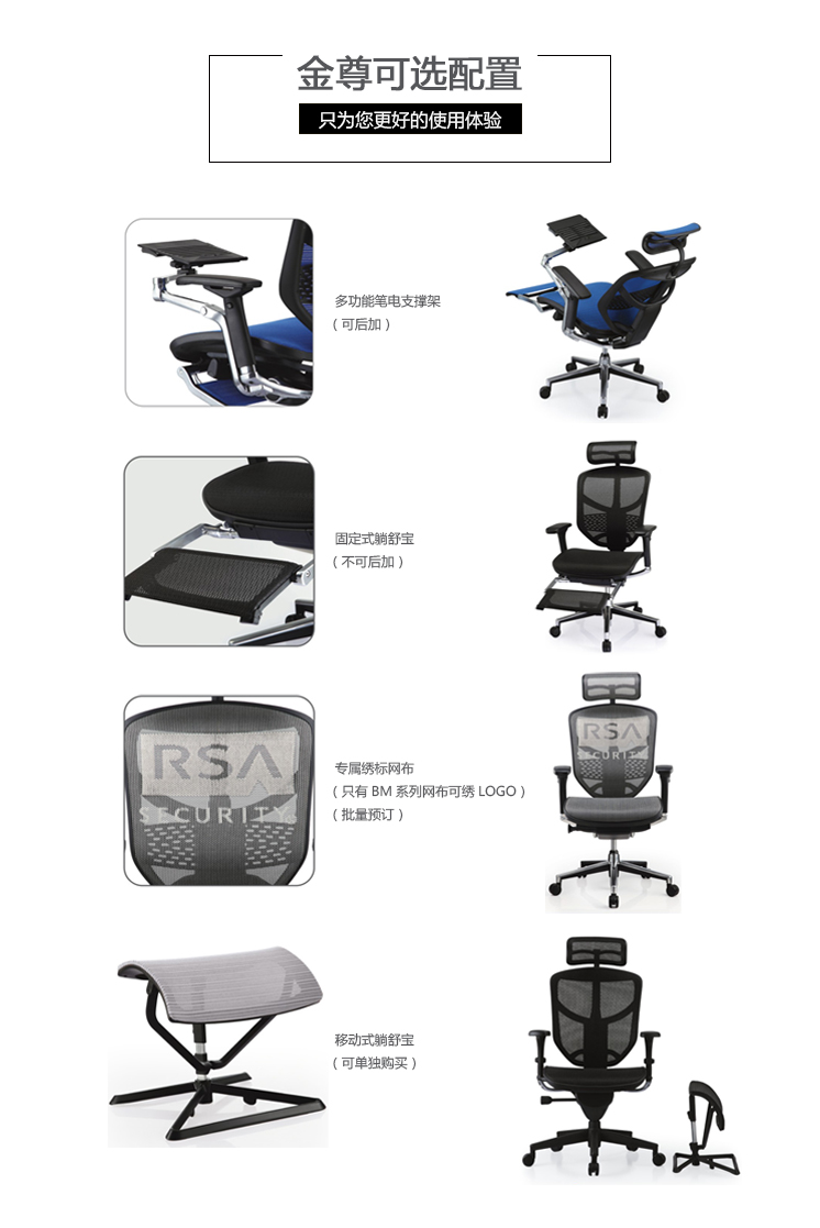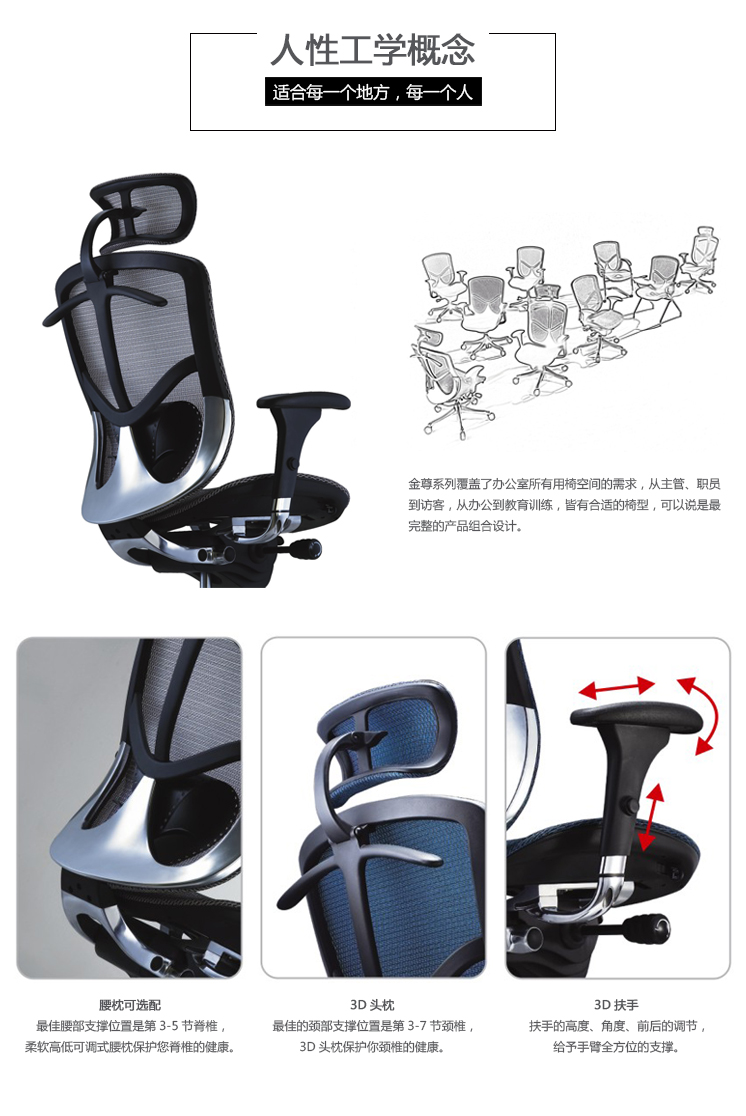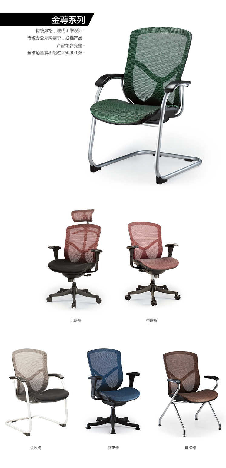 金尊系列覆盖了办公室所有用椅空间的需求,从主管、职员到访客,从办公到教育训练,皆有合适的椅型,可以说是最完整的产品组合设计