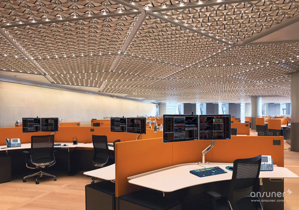Bloomberg欧洲新总部大楼项目建筑师,Foster + Partners建筑师事务所高级合伙人Michael Jones补充道:“建筑的设计反映了Bloomberg作为一个组织机构的价值所在及其运作方式。设计尽可能地把核心筒推到建筑边缘,以使楼层更为开阔;并在其中设置了一条螺旋坡道,作为建筑的核心,将工作人员带到了一起。总的来说,建筑内外的一切设计都是围绕社区和合作进行的。”团队合作理念同样体现在了办公桌系统和每层楼的平面布局上。定制的半圆形办公桌高度适宜,形成了最多容纳六个人的工作荚,为个人或小组提供了私密而又舒适的工作环境。