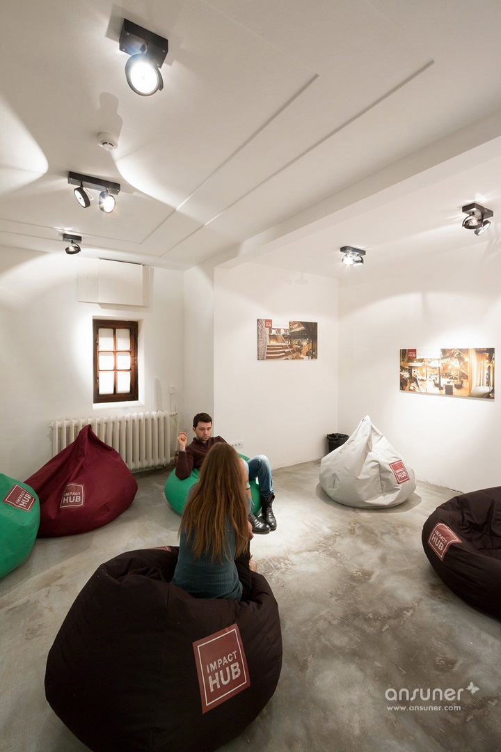 灵感的触动对于一个设计师,思考者来讲非常重要,IImpact Hub专业提供独特的系统资源、灵感和合作服务,帮助他们快速成长。教堂形的两层建筑大厅,分成三个双柱廊式拱券通道,并覆盖着大大的拱顶。因为功能需求,重新规划空间组织,一楼包括四间办公室、两间会议室、两个电话亭、厨房和厕所。所有这些功能都围绕中心共享工作空间而设。二层的平台,即可用作工作空间亦可在灿烂的夏日用作社交活动。